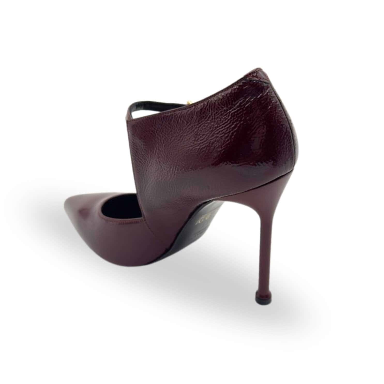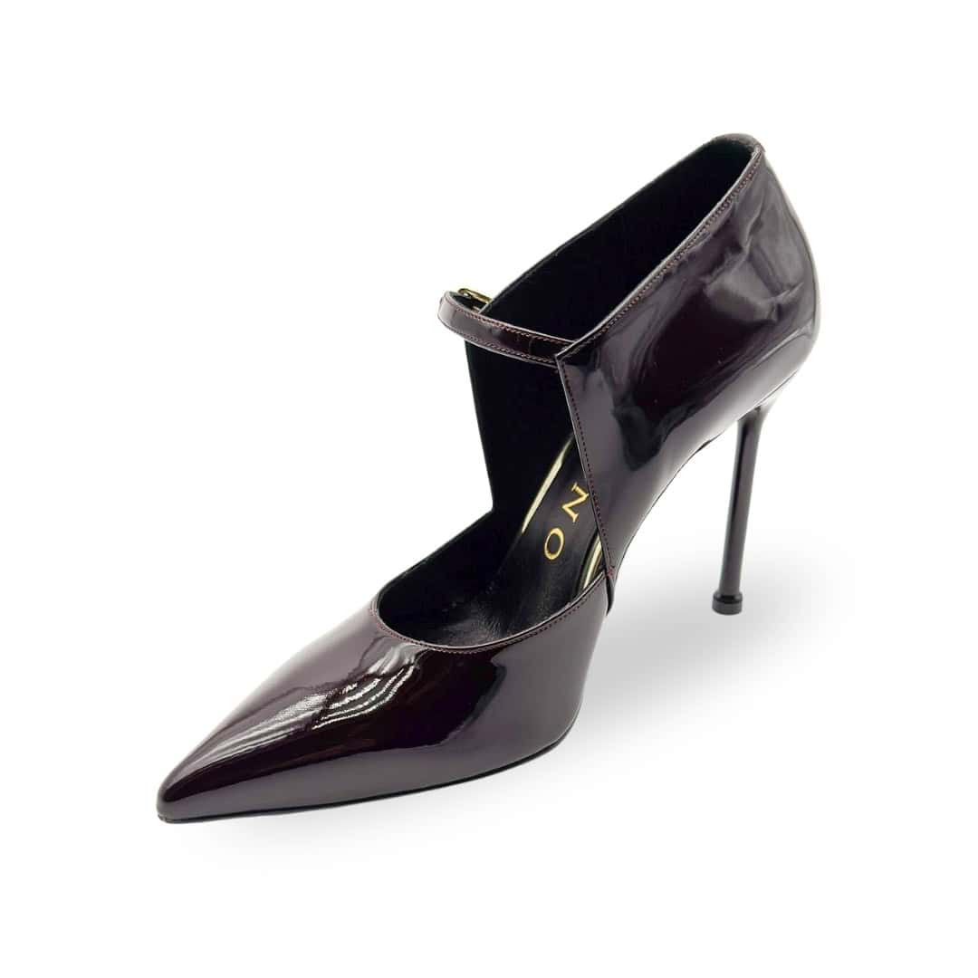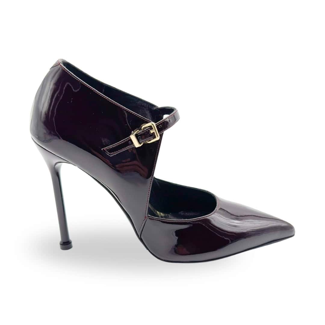 Pump in pelle con cinturino e tacco sottile. La silhouette sensuale e la finitura lucida ne fanno un modello dal fascino deciso, capace di trasformare anche il look più semplice in un’espressione di pura eleganza. Tacco 10cm. Interno in pelle.