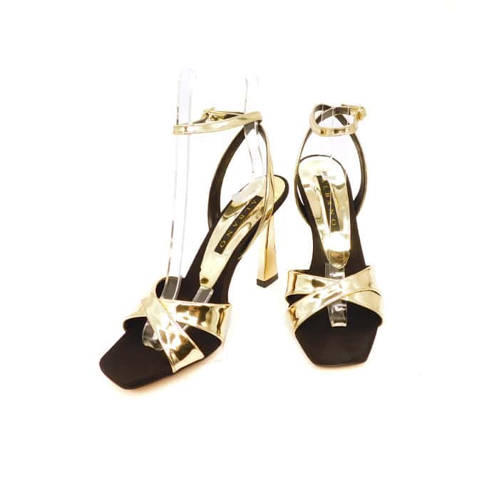 Sandalo laminato effetto specchio con cinturino alla caviglia regolabile. Interno in pelle. Tacco 10 cm.