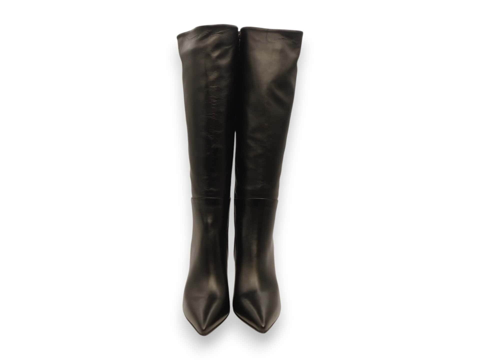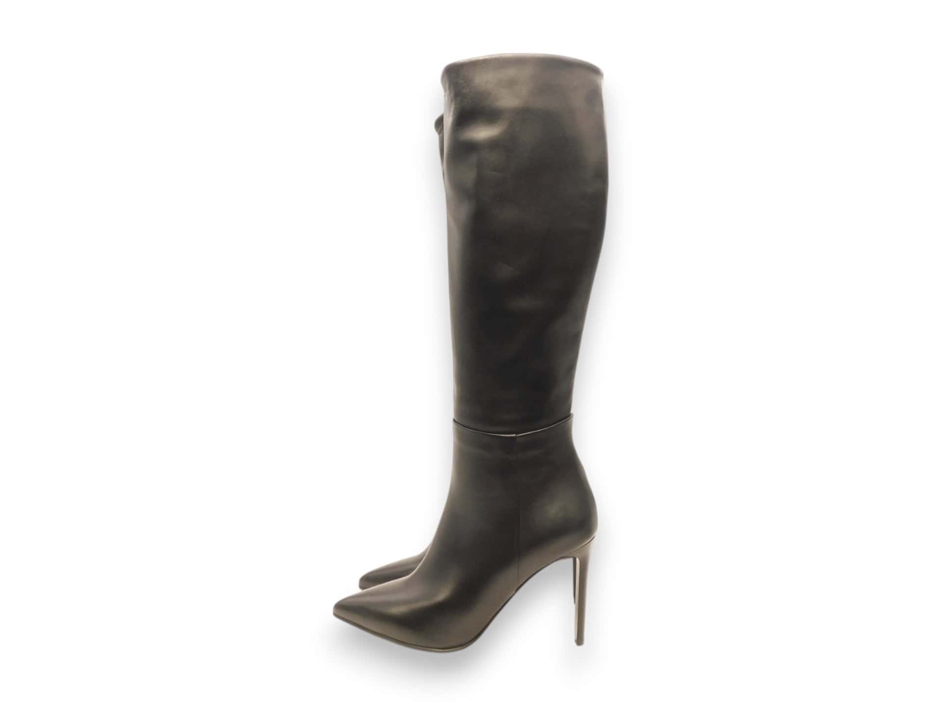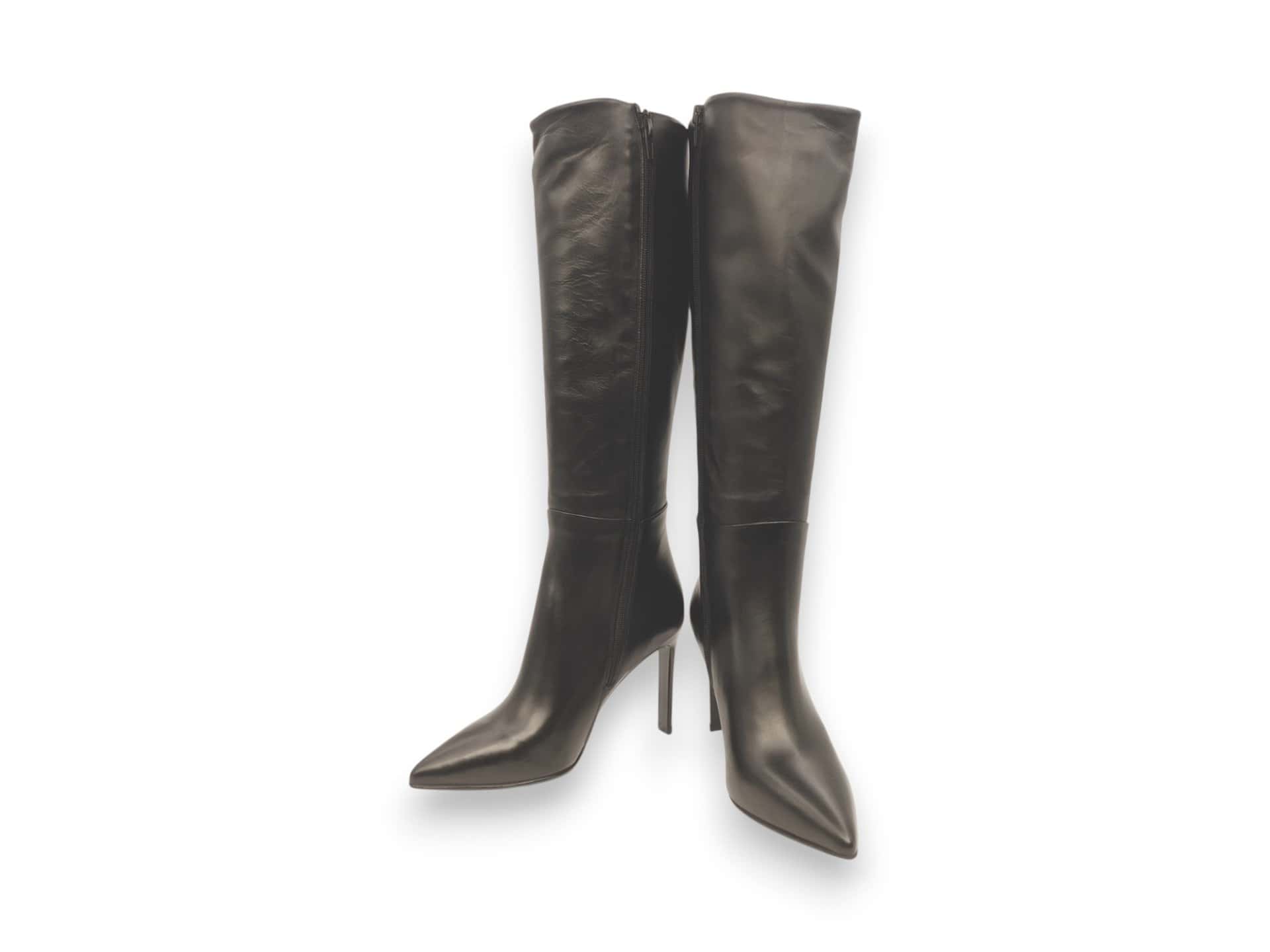 Stivale con tacco 10 cm fino. Tomaia in pelle. Interno in pelle. Fondo in cuoio. Allacciatura zip interna lunga.