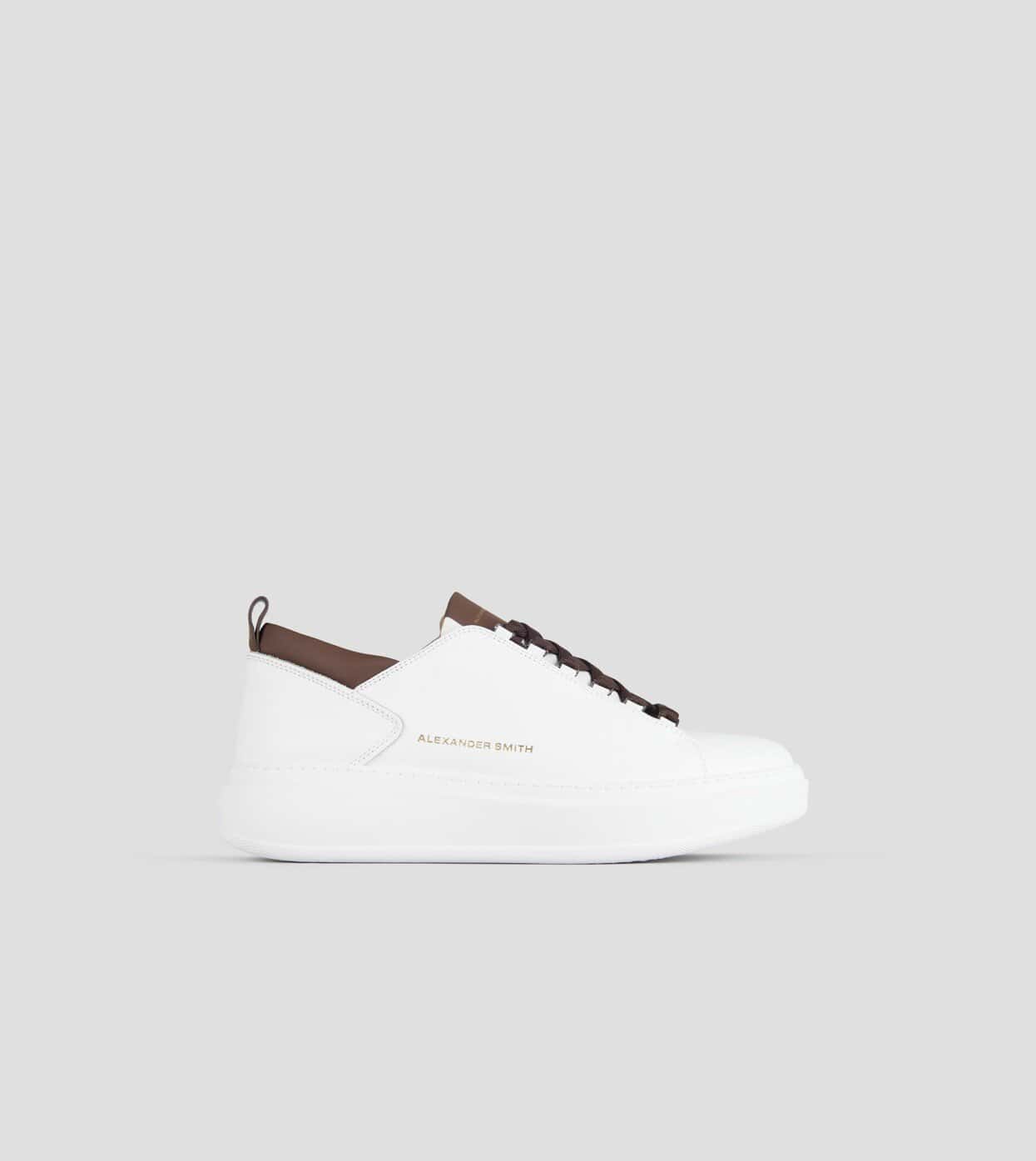 Wembley Uomo in morbida pelle bianca e dettagli marroni. Logo a lato e nel loop sul retro. Soletta interna removibile. Suola di 40 mm. Soletta interna di 10 mm.