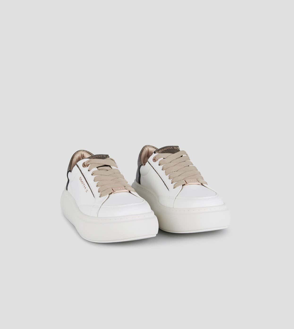 Logo sul lato e sul retro. Suola interna removibile. Suola di 45 mm. Suola interna di 10 mm. Sneakers in bianco con tallone laminato glitter bronzo.