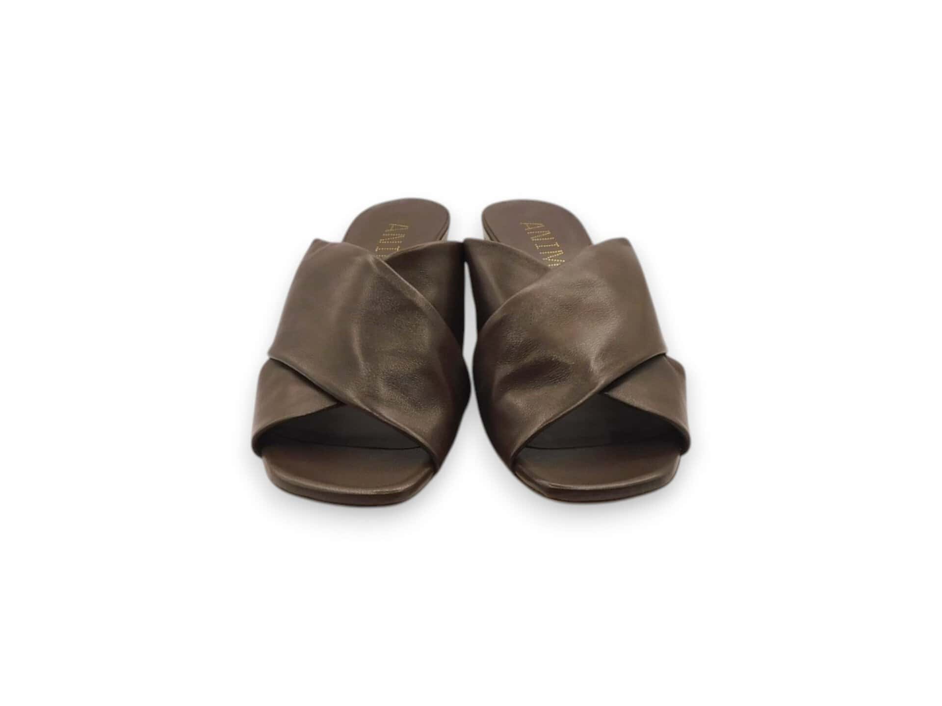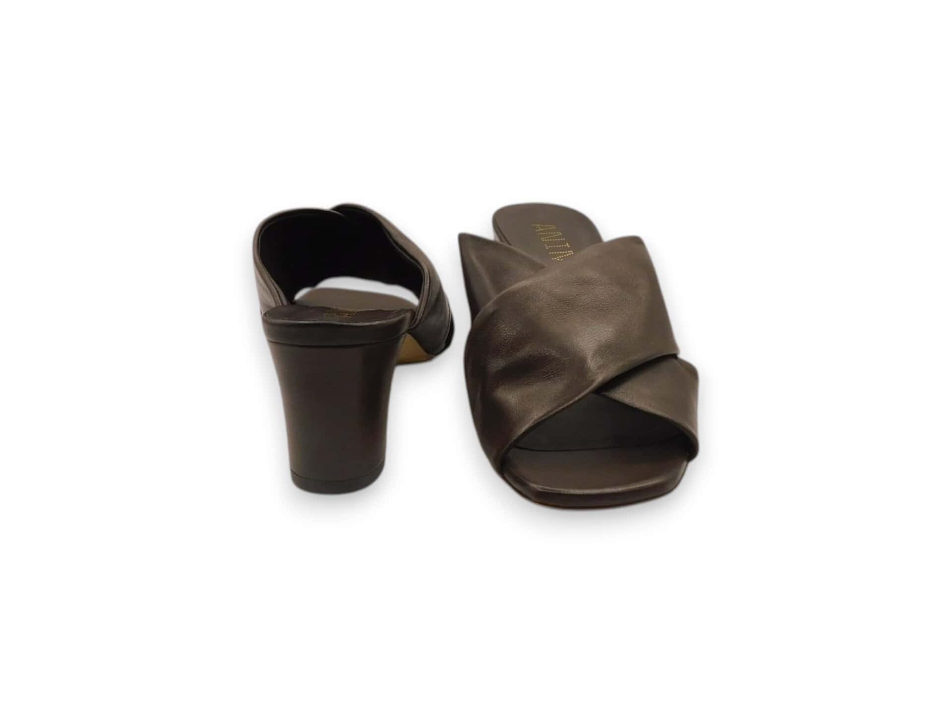 Ciabatta tacco 6 cm. Fasce incrociate in vitello morbido. Fondo in cuoio.