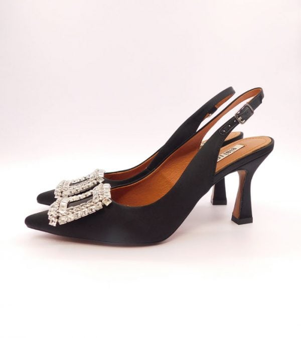 Chanel in raso con accessorio. Interno in pelle. Tacco 7 cm. Fondo in cuoio.
