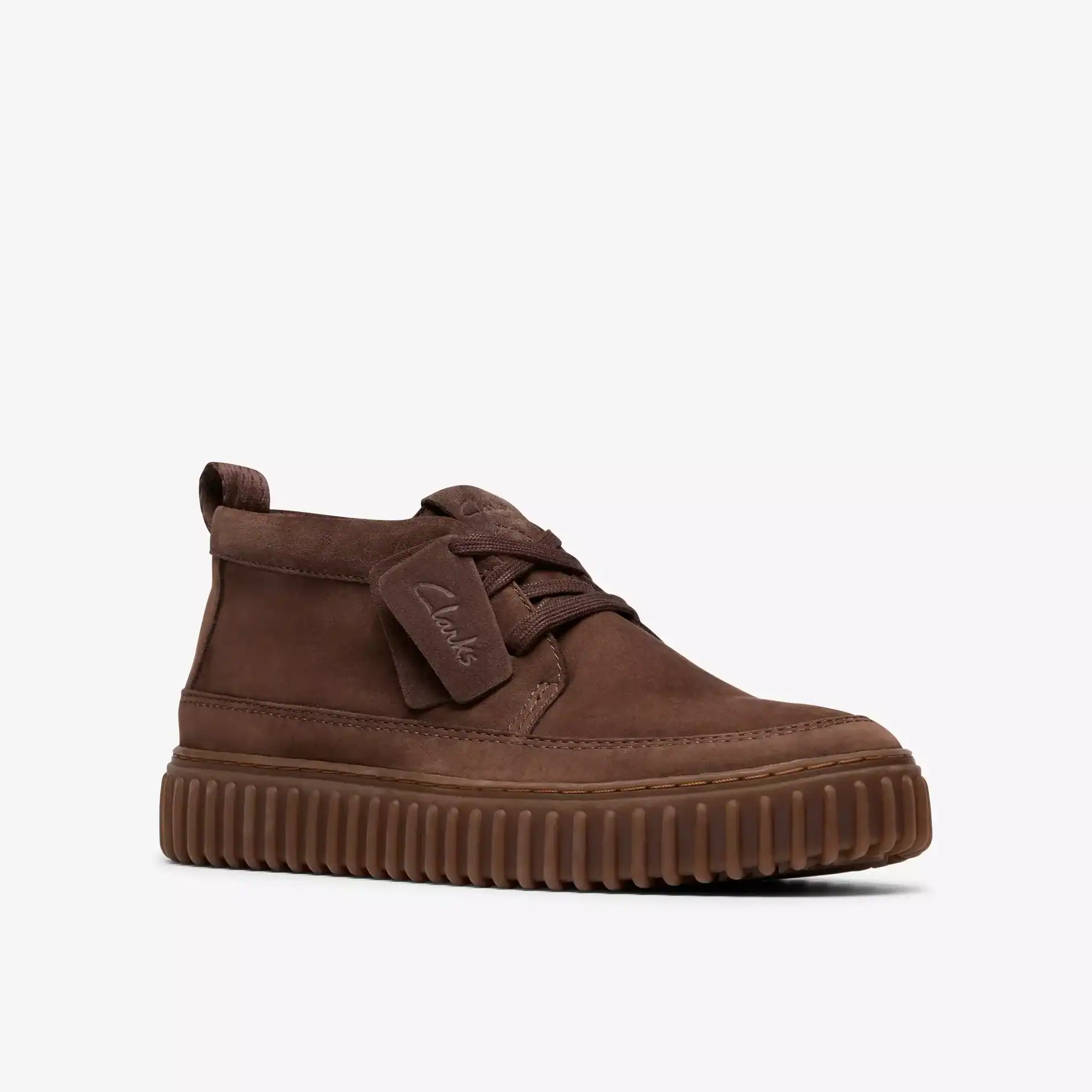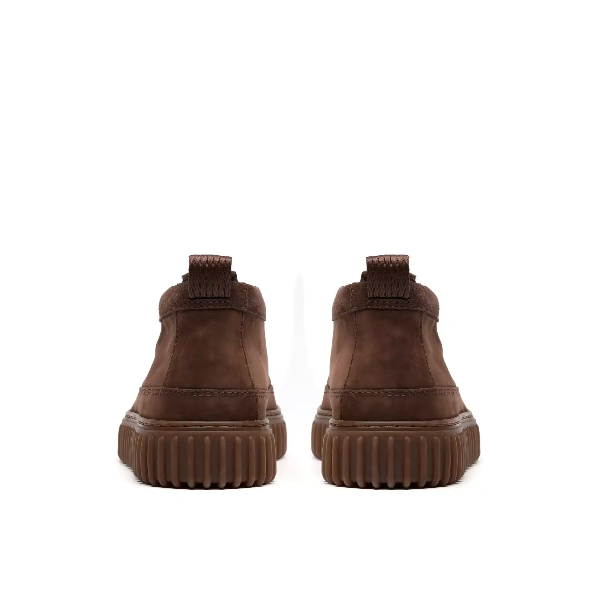 Tomaia in nabuk marrone scuro premium. Lacci regolabili per una calzata sicura. Plantare Contour Cushion in pelle modellato e rimovibile che supporta ogni passo. Suola TR (gomma termoplastica) resistente e scanalata con riempitivo in EVA che offre trazione leggera.