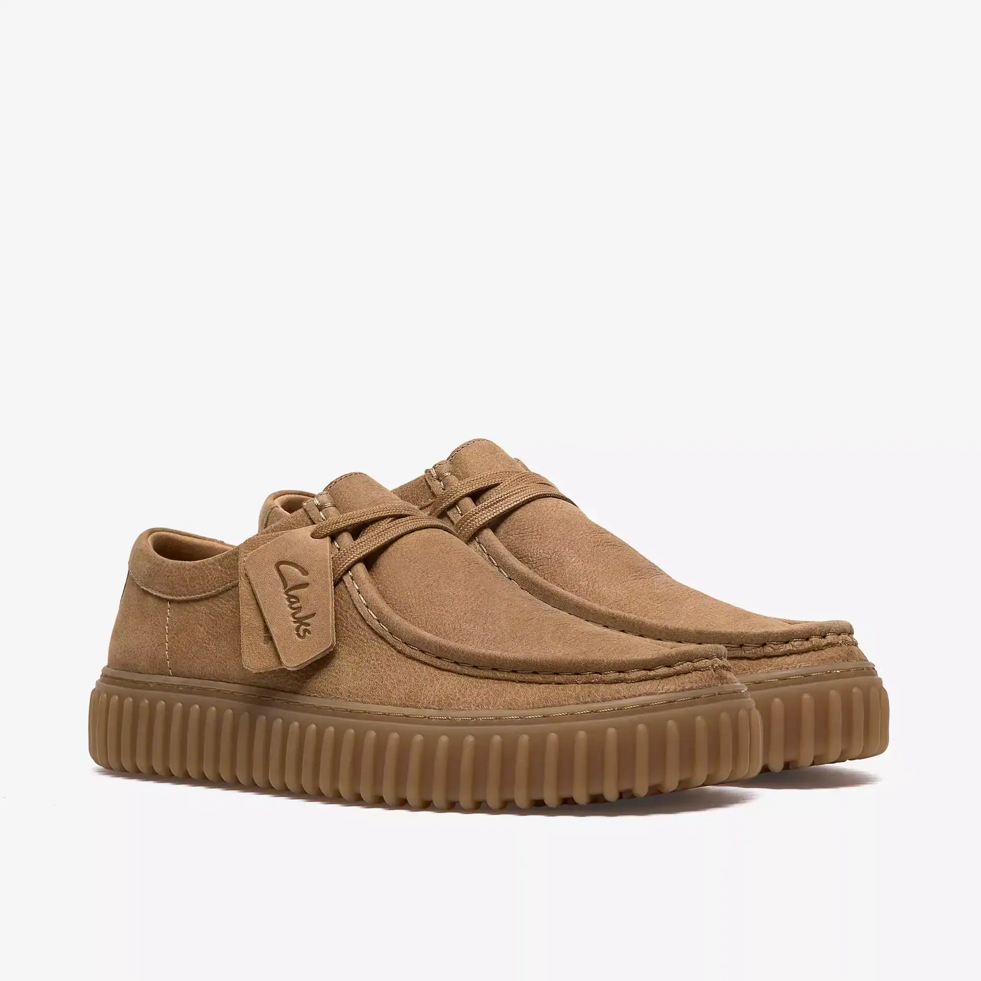 Tomaia in pelle premium sabbia scura. Lacci regolabili per una calzata sicura. Plantare Contour Cushion in pelle modellato e rimovibile che supporta ogni passo. Suola durevole in TR (gomma termoplastica) con riempitivo in EVA che offre trazione leggera. Completo di due fobs in rilievo (logo Clarks e logo Torhill) per rendere omaggio al patrimonio di Clarks.