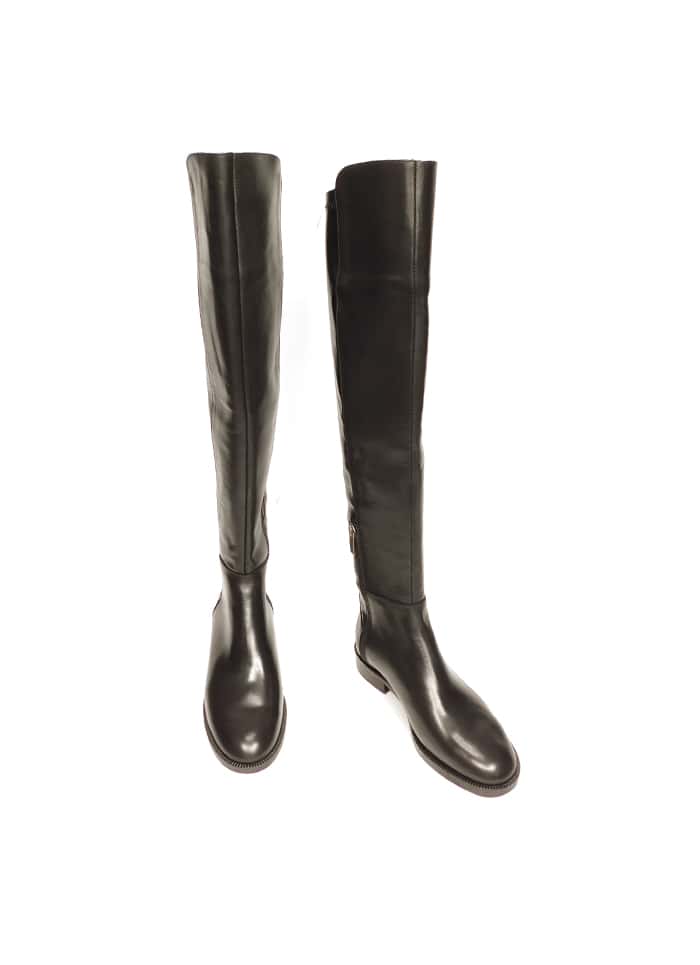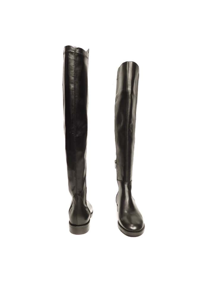 Stivale in vitello nero al ginocchio con gambale elasticizzato. Interno in pelle. Fondo in gomma.