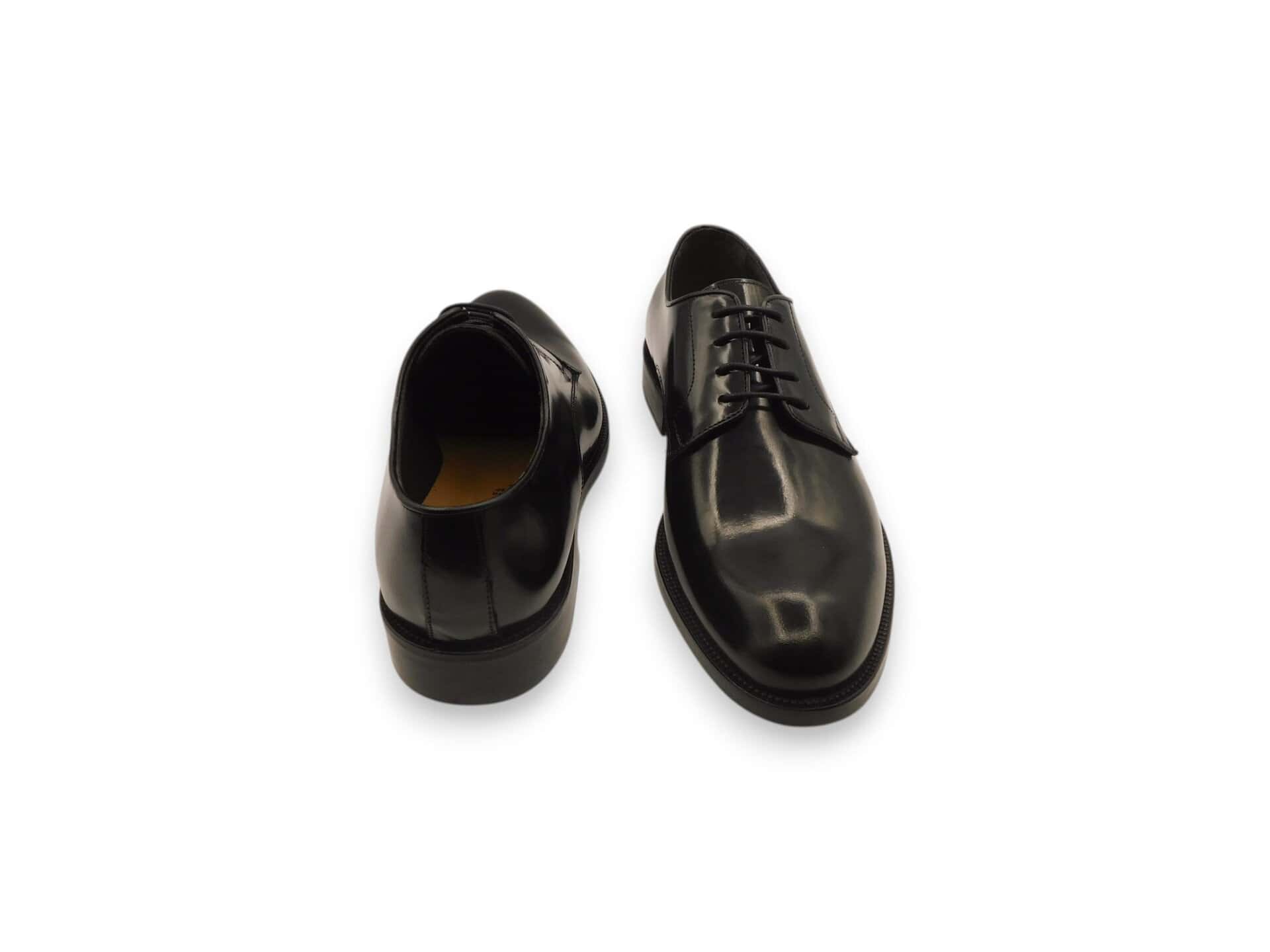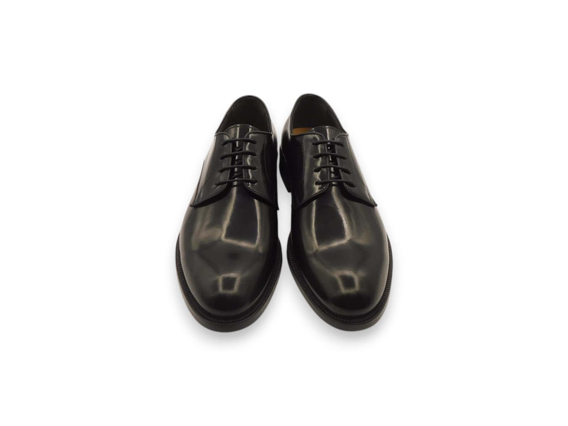 Scarpa allacciata, Derby, in vitello spazzolato. Fondo in cuoio. Interno in pelle.