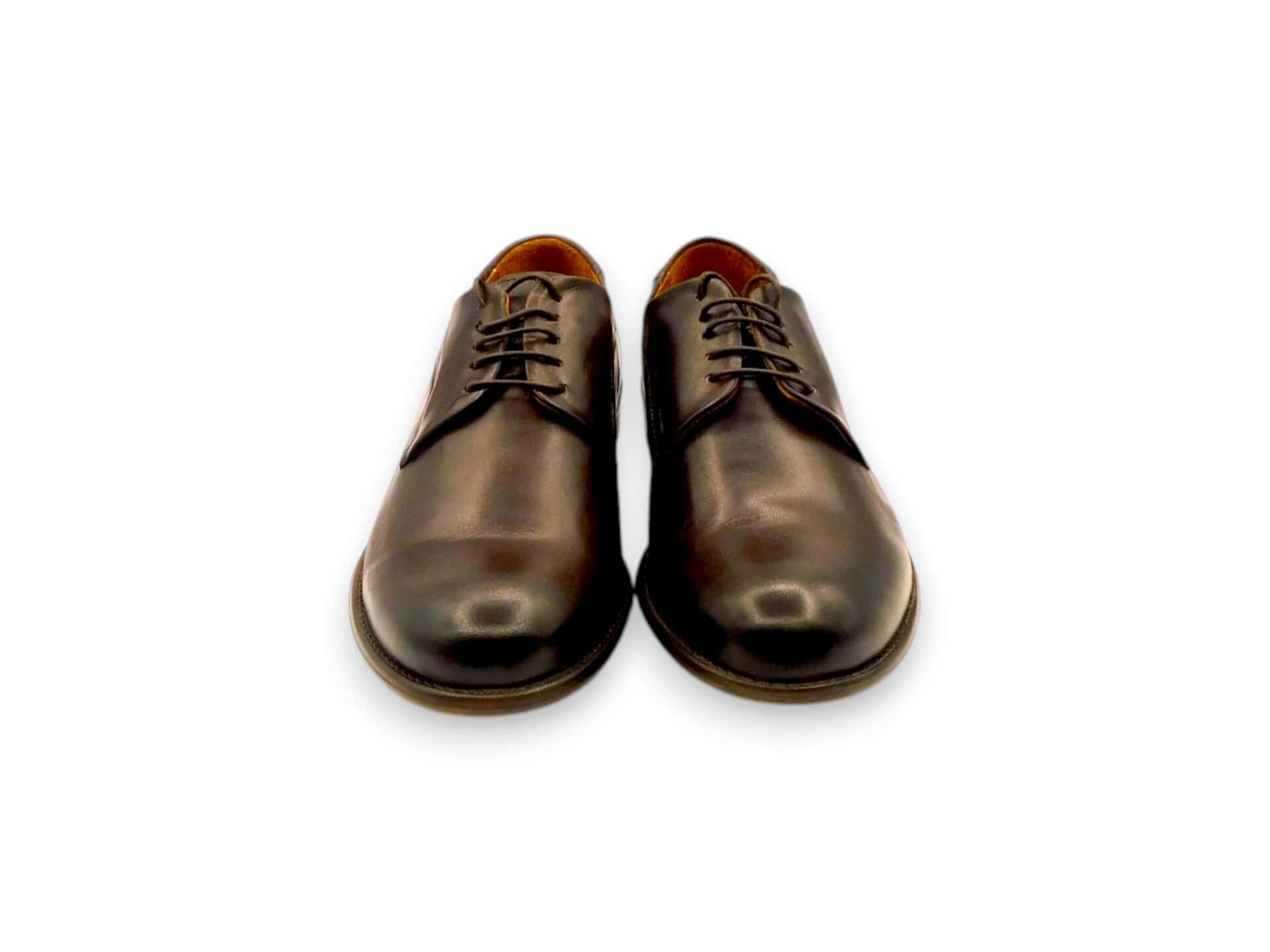 Scarpa allacciata Derby in vitello marrone. Fondo in cuoio.