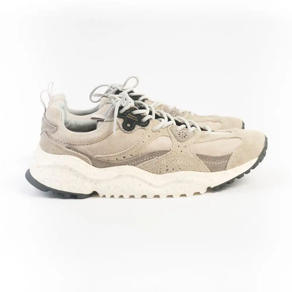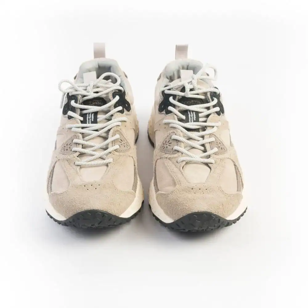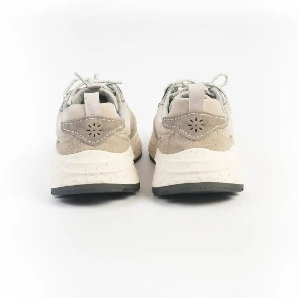 Sneakers in morbido camoscio di colore tortora, grigio chiaro e grigio scuro e targhetta di colore nero. Lacci in cotone di colore ghiaccio. melange. Soletta interna in sughero amovibile. Maxi suola in gomma avorio antiscivolo con battistrada dentellato. Calzata regolare.