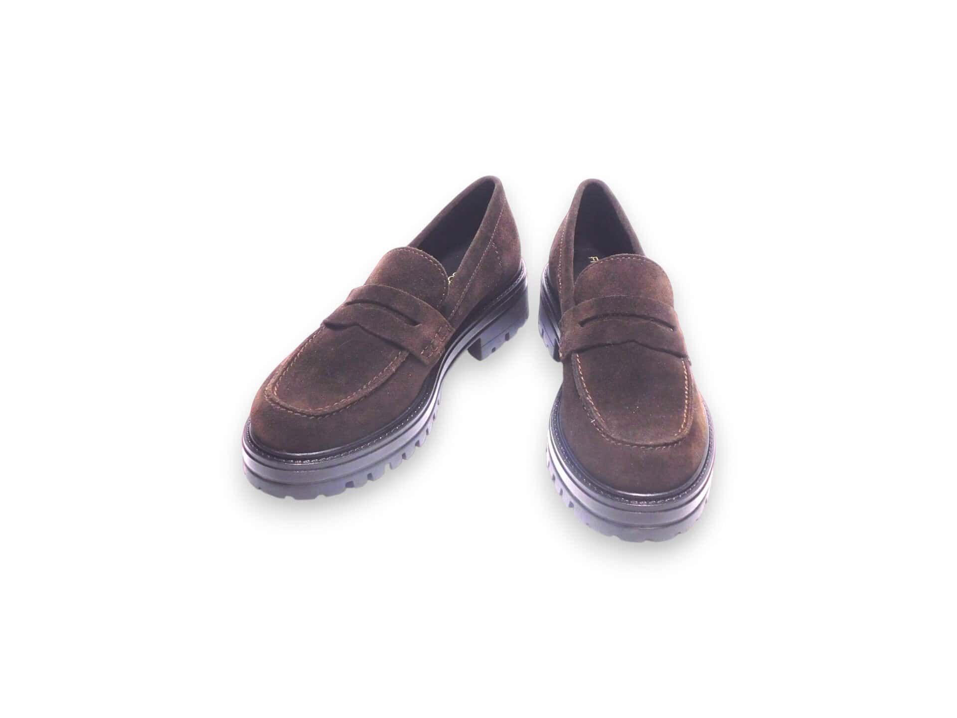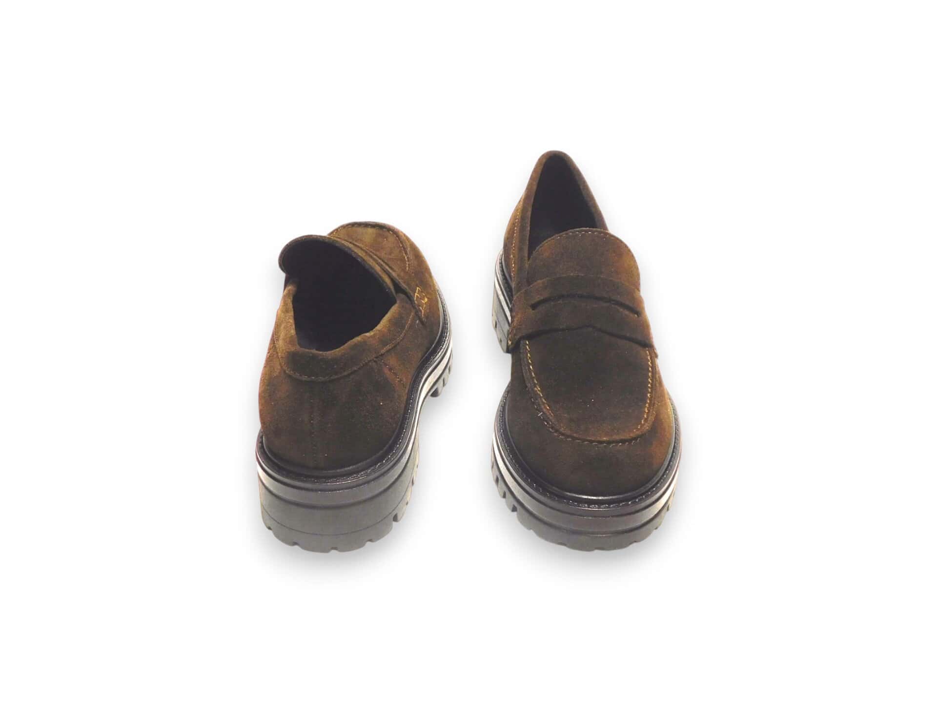 Mocassino con gomma carrarmato. Interno in pelle e tessuto. Tomaia in pelle scamosciata.