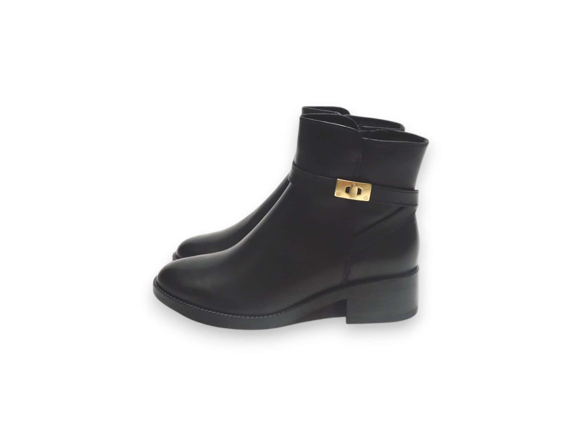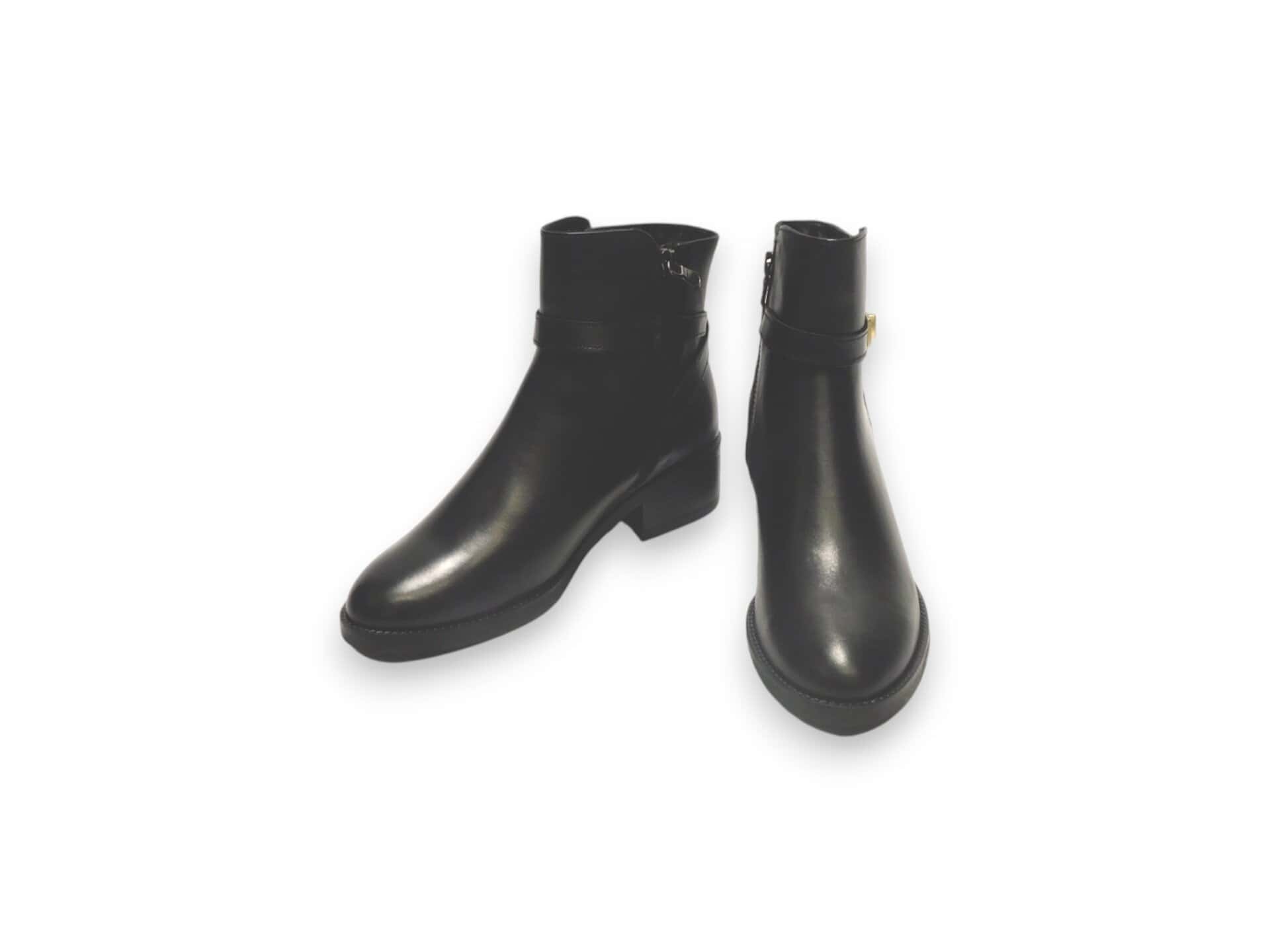 Tronchetto in pelle. Fondo in cuoio e gomma antiscivolo. Interno in tessuto caldo. Cinturino con chiusura in metallo colore oro. Zip interna. Tacco 3 cm.