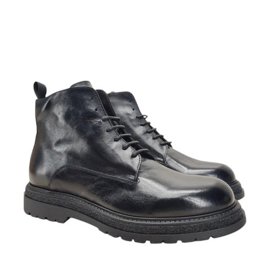 Anfibio in vitello. Fondo carrarmato in gomma. Allacciatura e zip interna. Interno in pelle.