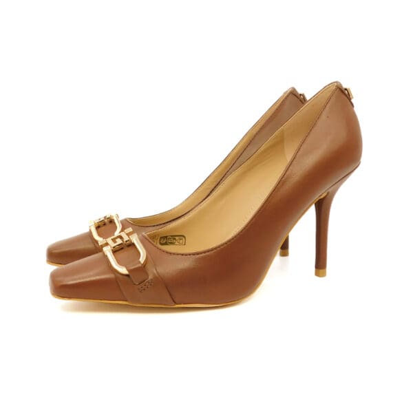 Décolleté in vitello con punta squadrata e morsetto dorato con logo. Interno in pelle. Tacco 9 cm. Fondo antiscivolo.
