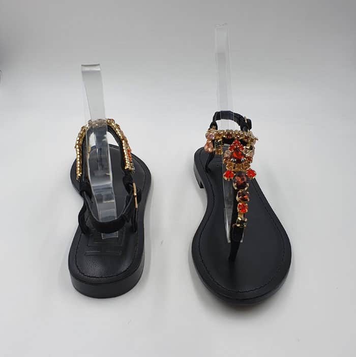 Sandalo infradito in camoscio nero con pietre colorate. Interno in pelle. Fondo in cuoio.