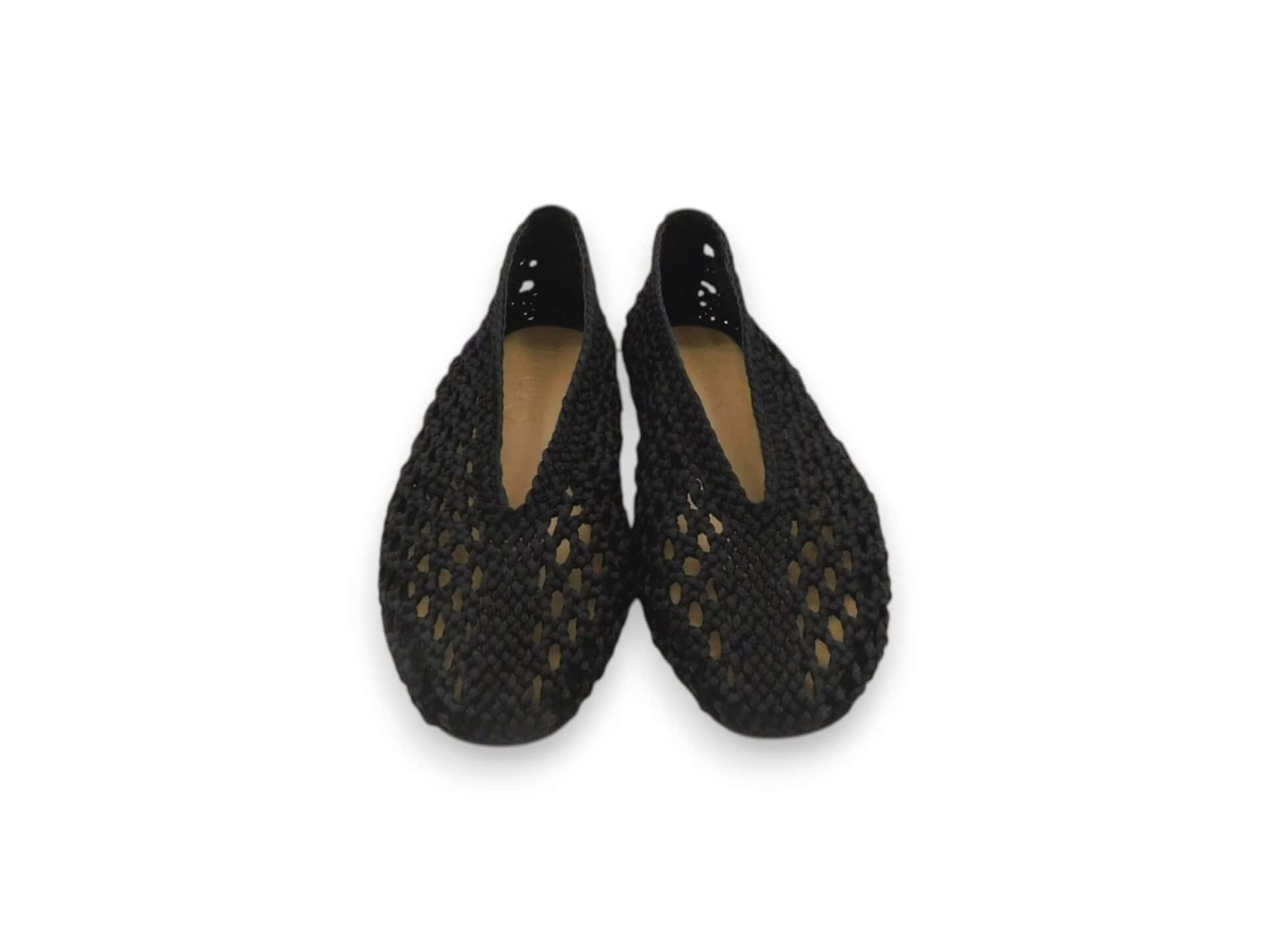 Scarpa bassa tomaia in tessuto con lavorazione aperta e compatta. Modello a pantofola con scollo a V e profili lisci. Plantare leggermente imbottito . Suola in gomma sottile color cuoio con base in tinta. Altezza suola 1 cm.