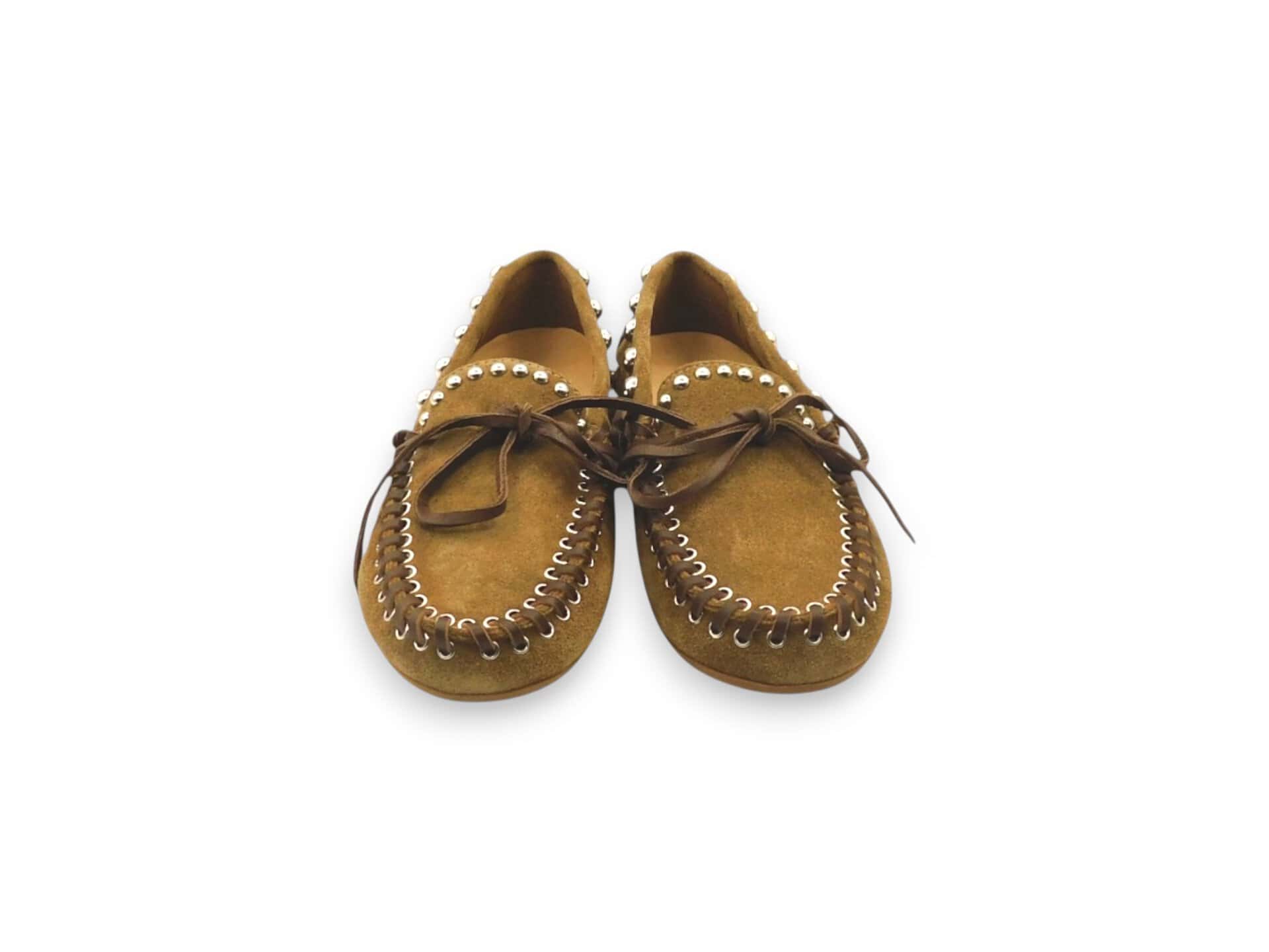 Mocassino in camoscio modello “barca”con borchiette in metallo e laccio in cuoio in tono. Fondo in gomma leggera.