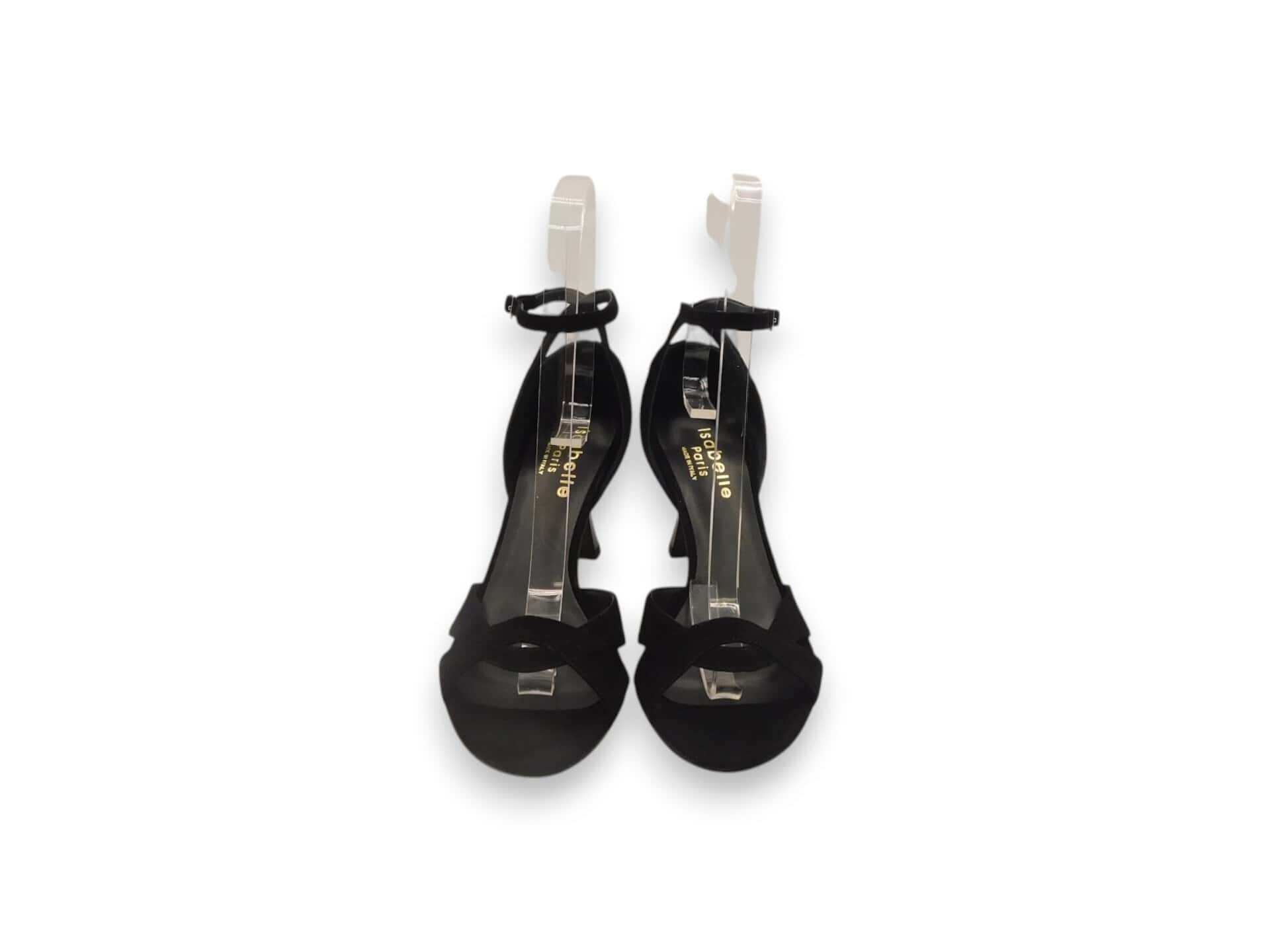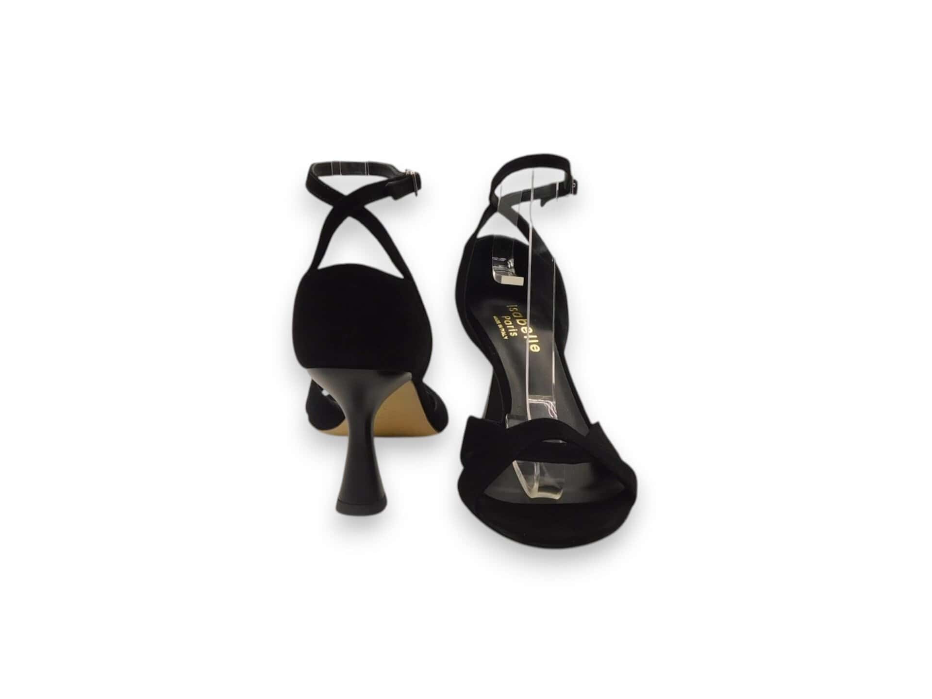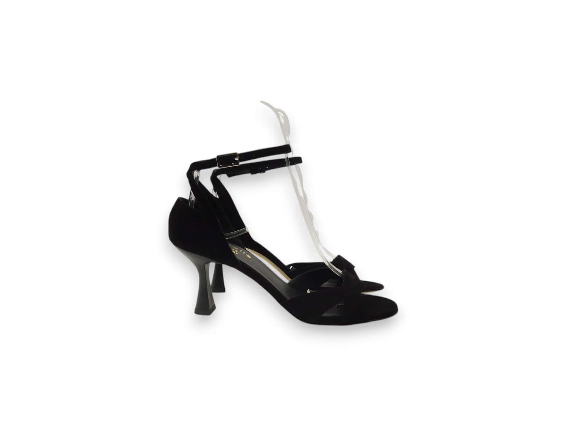 Tomaia: morbida pelle scamosciata con listini incrociati. Fodera: pelle naturale per un contatto delicato con il piede. Dettaglio: cinturino regolabile alla caviglia con fibbia in metallo dorato. Tacco: modello a rocchetto per un mix perfetto di stile e stabilità. Fondo: gomma antiscivolo per una tenuta sicura. Altezza del tallone dal suolo: 7 cm.