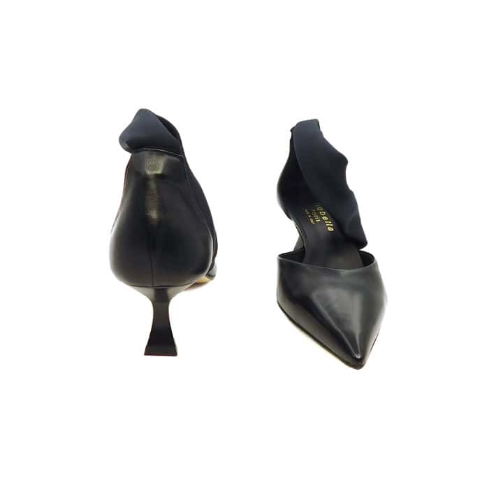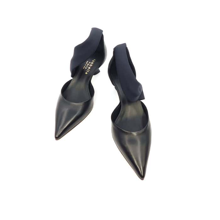 Décolleté spezzato in nappa nera. Nastro in neoprene. Interno in pelle. Tacco 5 cm. Fondo in cuoio. Made in Italy.