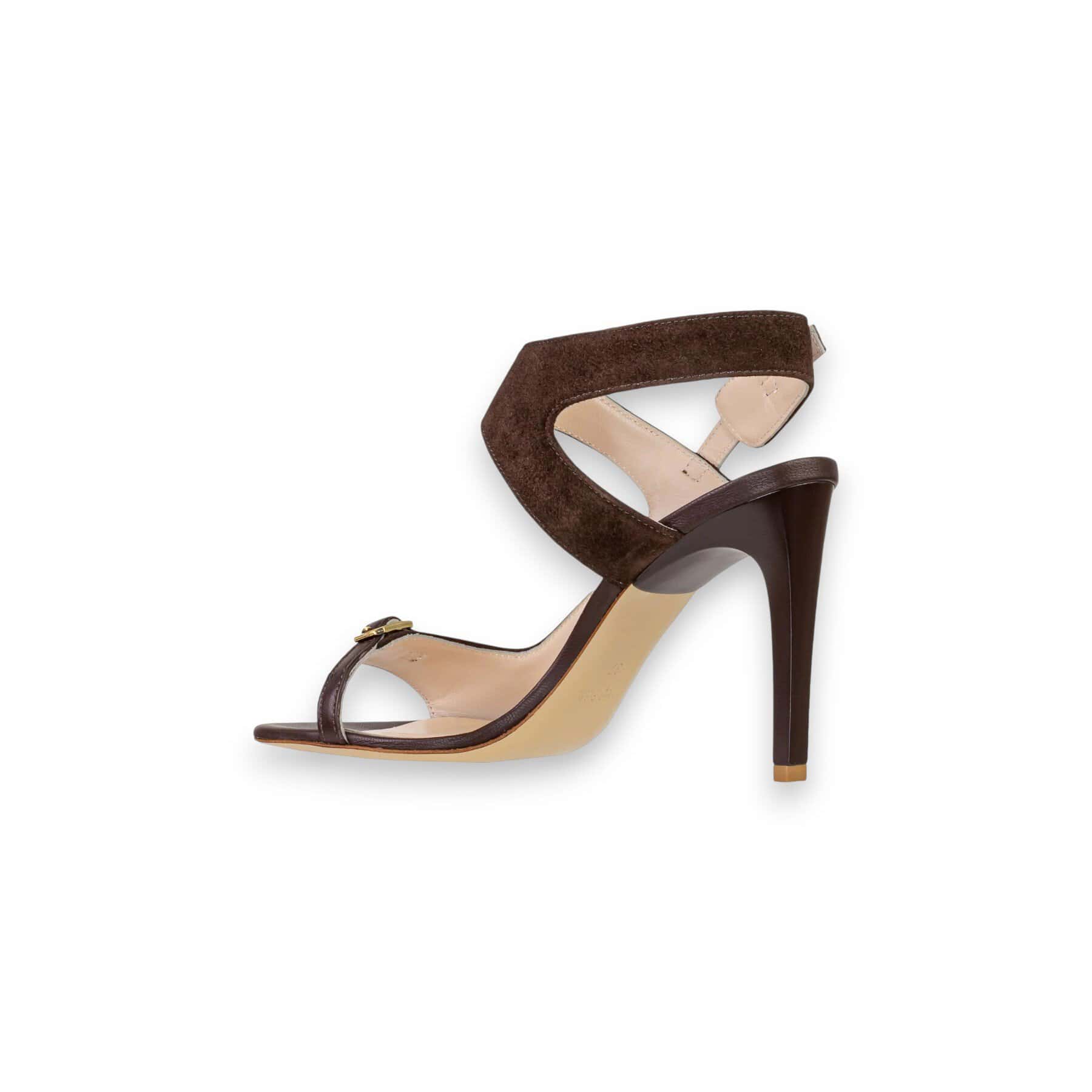 Tomaia: realizzata in vellutato camoscio marrone scuro (chiodino) con inserti, cinturini e passante in nappa marrone scuro coordinata, e fibbia decorativa sulla fascia anteriore. Fodera interna: interamente in morbida pelle color nudo per garantire massima traspirabilità e comfort. Colore: marrone scuro intenso e naturale per camoscio e nappa, con fibbie metalliche dorate lucide. Sottopiede: imbottito e rivestito in pelle color nudo. Suola: in vero cuoio naturale per una finitura di alto pregio e durata. Tacco: a stiletto da 9 cm, rivestito in nappa marrone scuro coordinata. Altezza del tallone dal suolo: 9 cm.