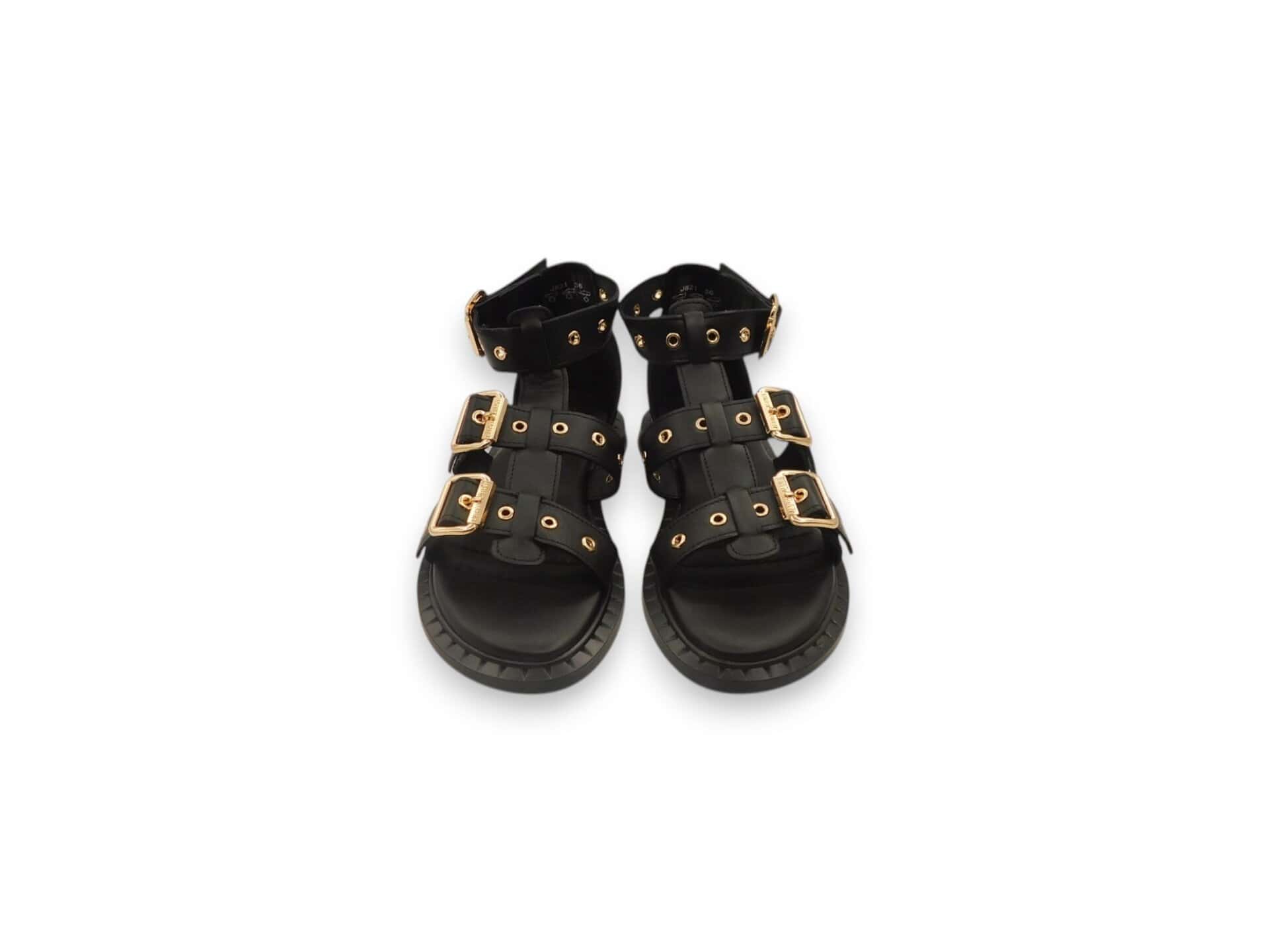 Sandalo flat in vitello accollato con 3 fibbie e chiusura in metallo color oro. Fondo basso in tono.