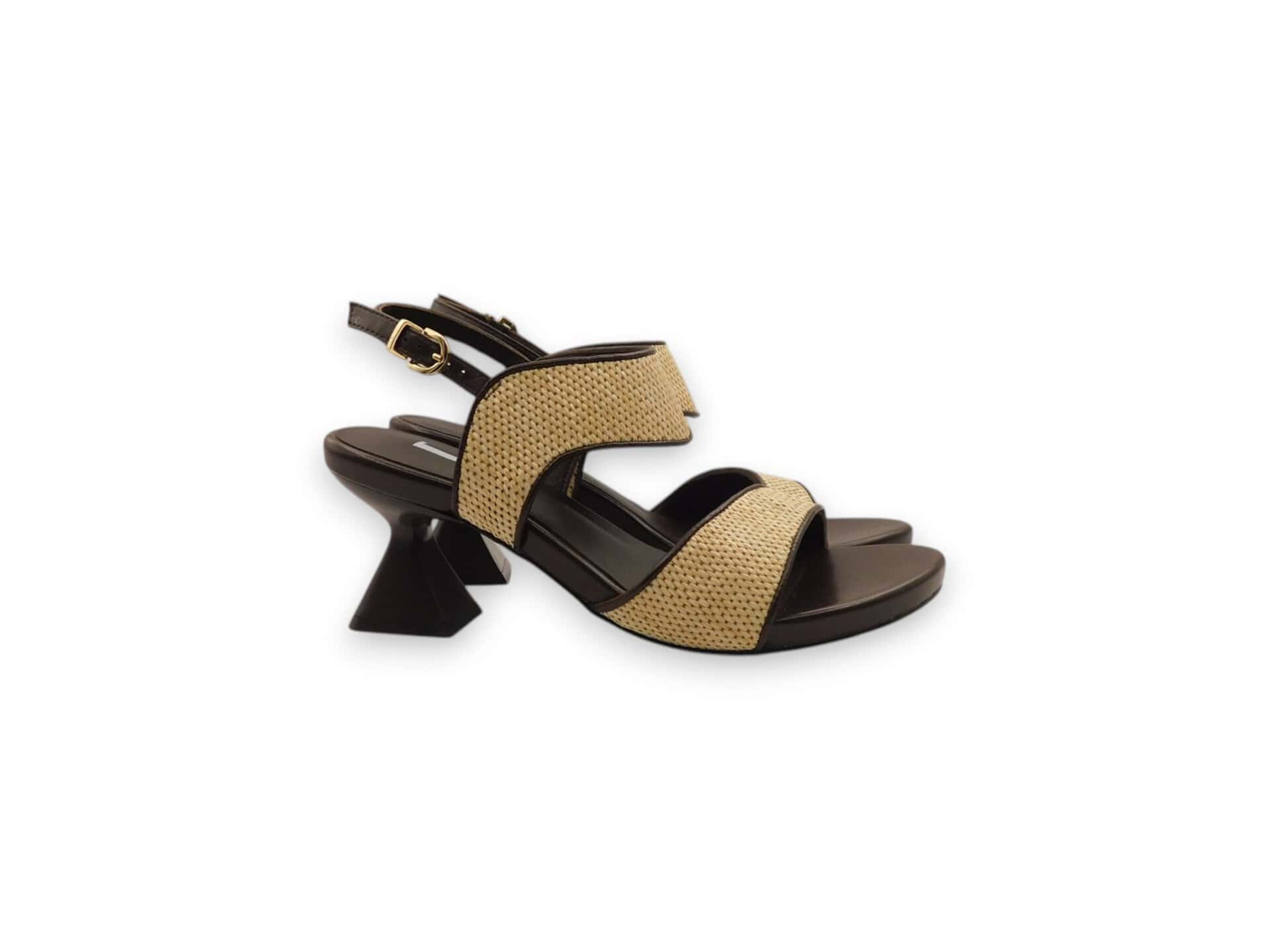 Sandalo con doppie fasce in raffia e vitello. Tacco geometrico 6 cm. Fondo in gomma.