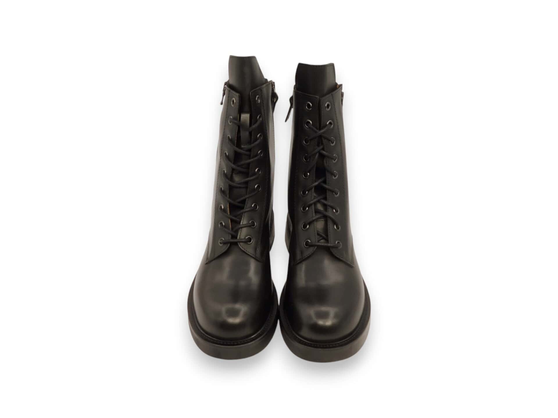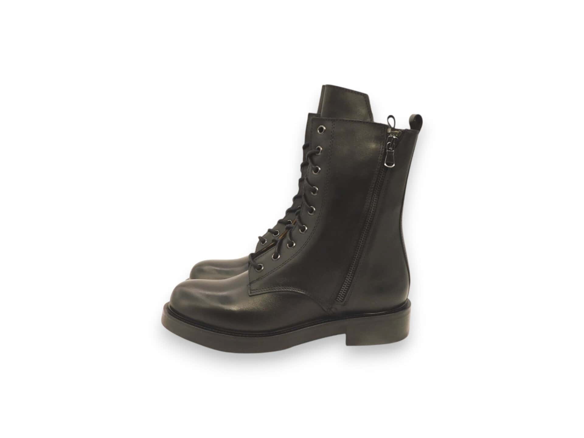 Anfibio con 2 zip sui lati della scarpa. Fondo in gomma. Interno in pelle. Lacci per chiudere.