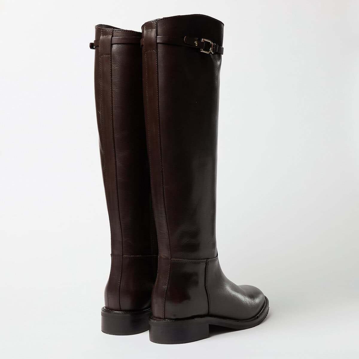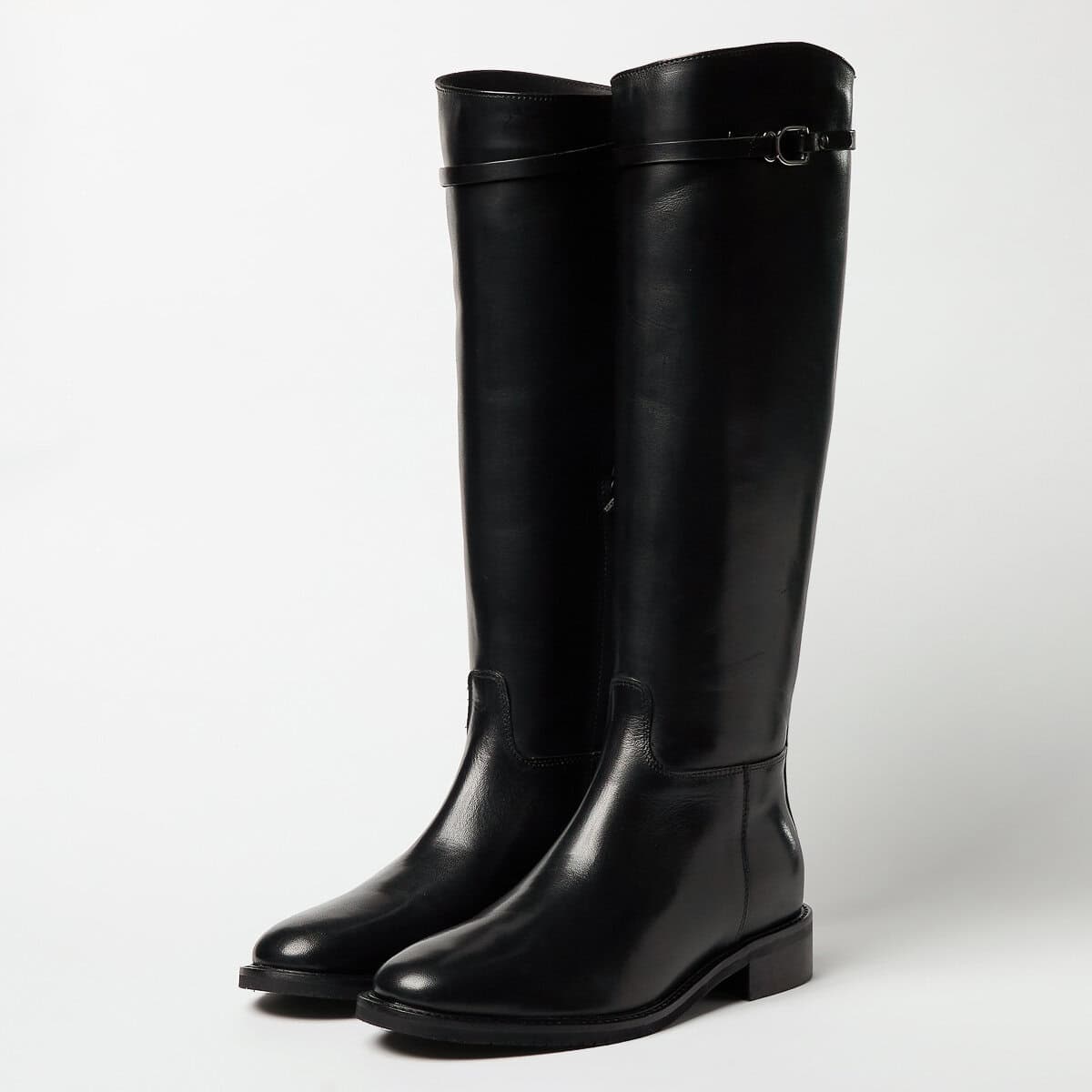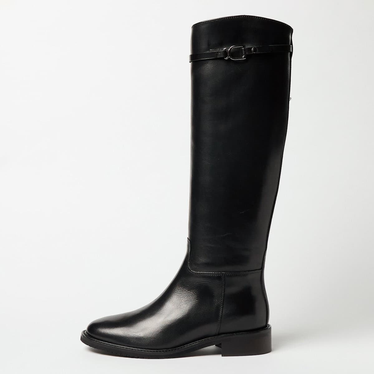 Stivale in pelle con accessorio in metallo sul gambale. Mezza zip interna. Fondo in cuoio e gomma antiscivolo. Tacco 2 cm.