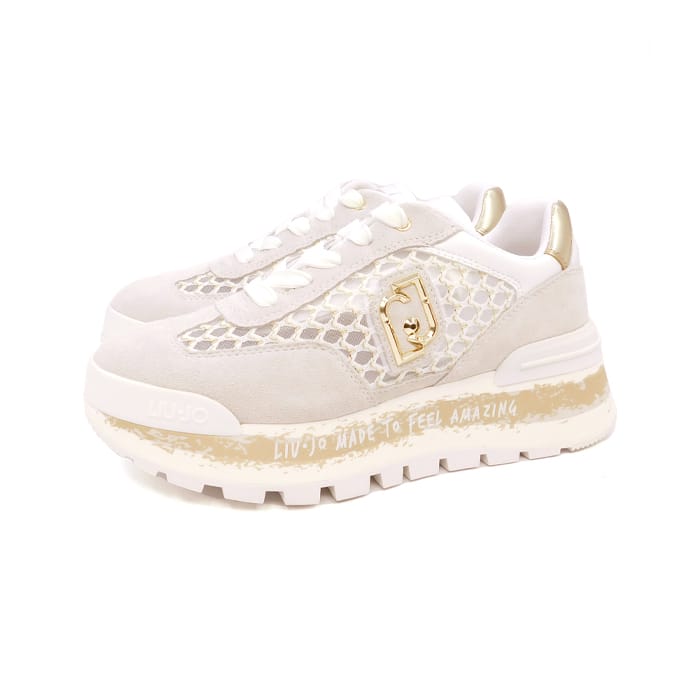 Sneaker in camoscio e tessuto a rete bianco ed oro. Fondo zeppa logata 4 cm. Logo laterale dorato. Modello: Amazing 23.