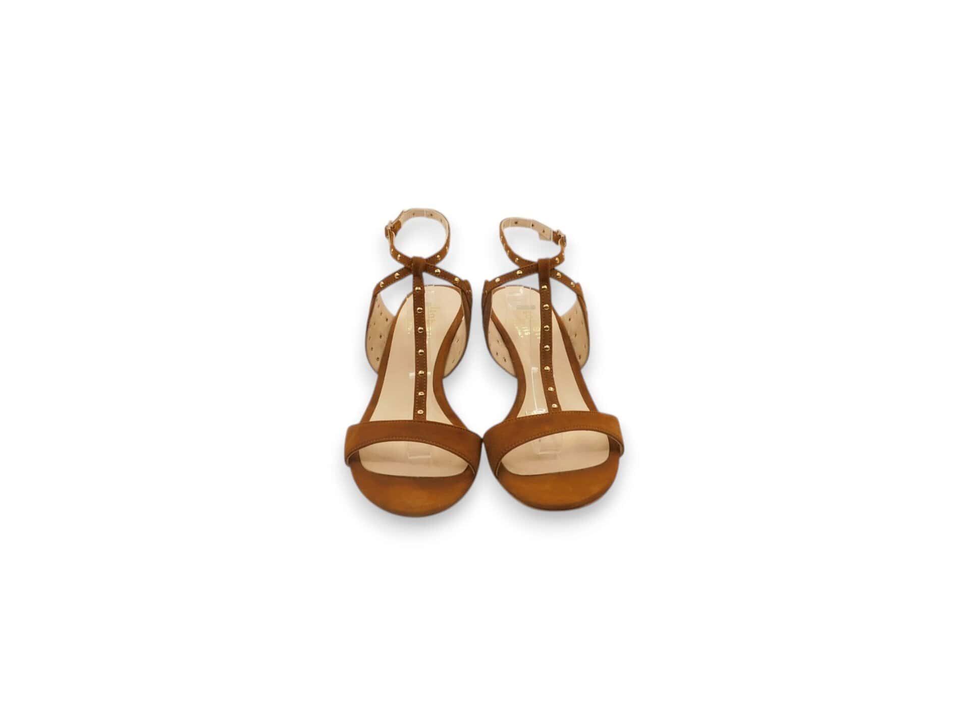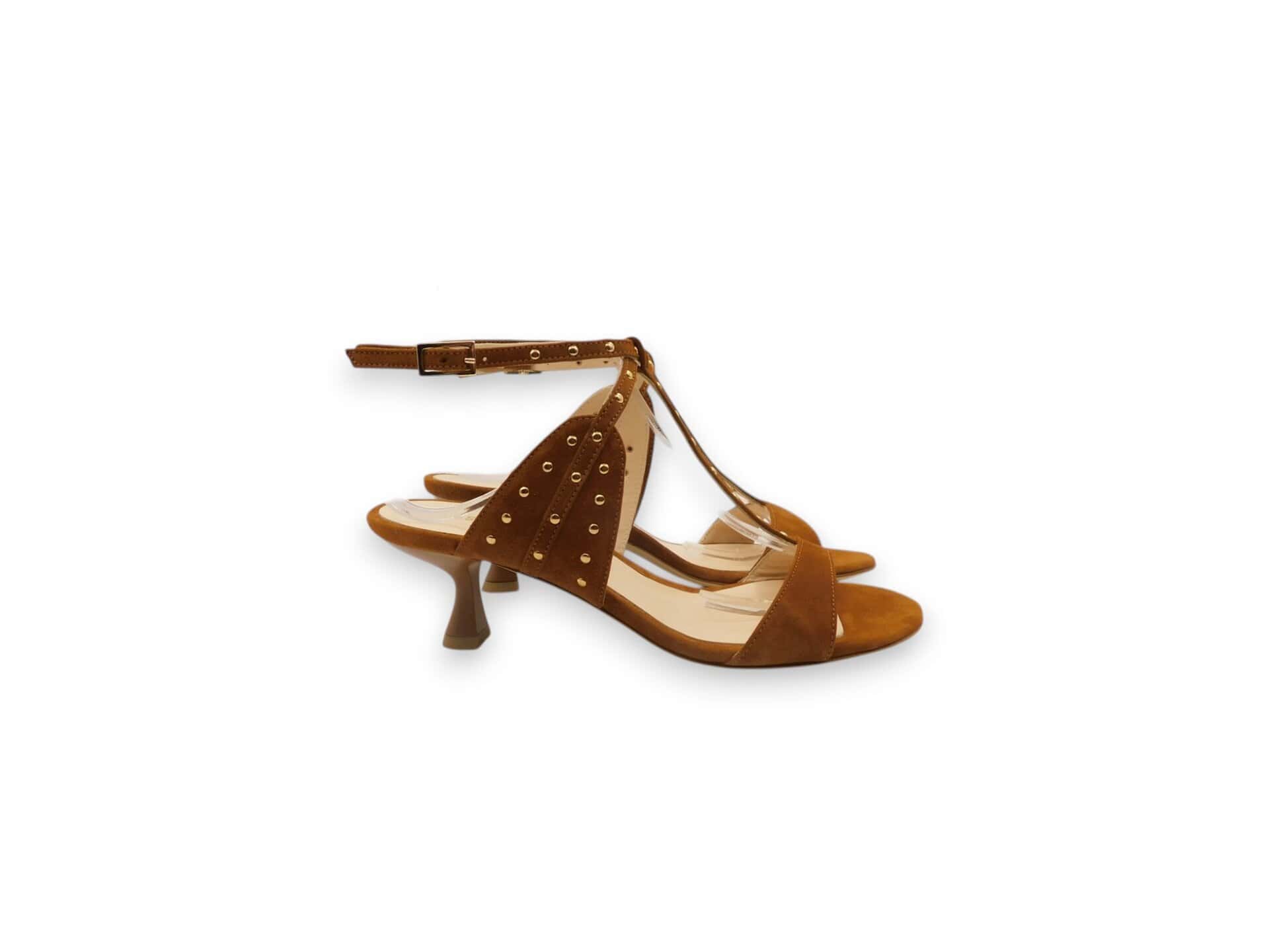 Sandalo in pelle scamosciata. Cinturino sulla caviglia impreziosito con borchie in metallo. Tacco 5cm. Fondo in cuoio.