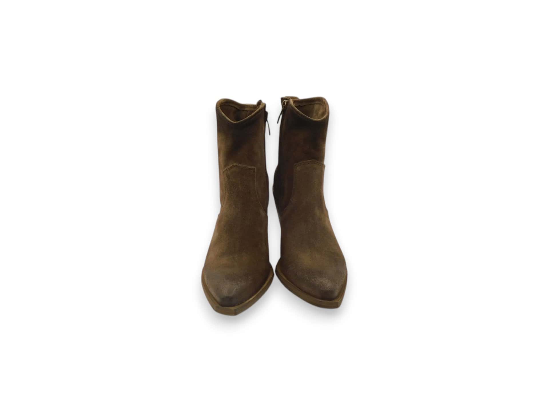 Texano con tacco 6 cm. Tomaia in pelle scamosciata ingrassata. Fondo in cuoio.