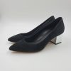 Decollete in camoscio nero. Interno in pelle. Tacco metallizzato con brillantini 5 cm. Fondo in gomma.