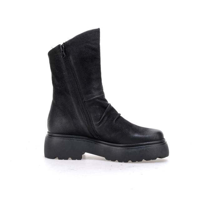 Tronchetto in pelle ingrassata. Tomaia in pelle con pieghe per rendere la scarpa di carattere. Fondo in gomma carrarmato alto 5.5 cm. Interno in pelle e tessuto caldo.