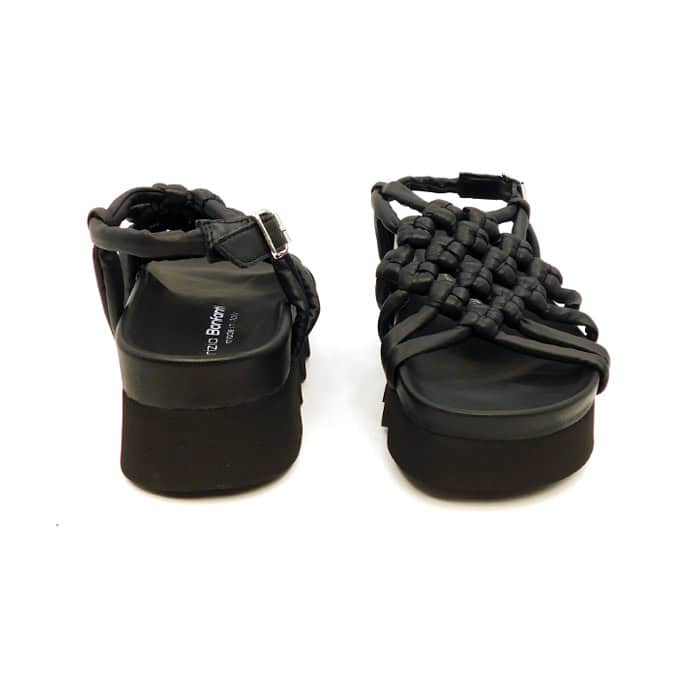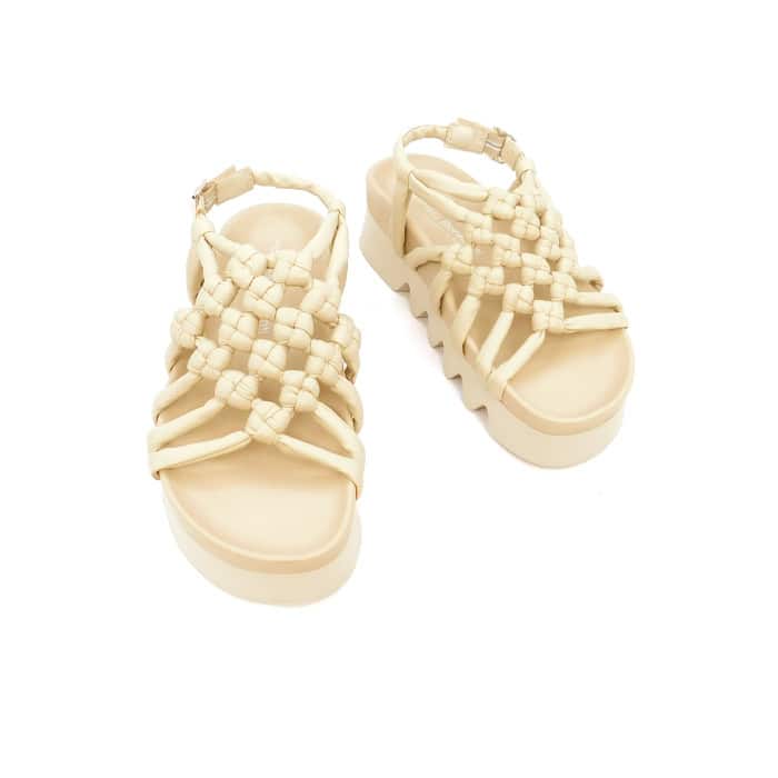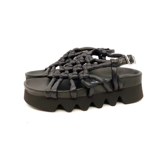 Sandalo in vitello con intreccio nodi. Interno in pelle. Fondo zeppa 5 cm.