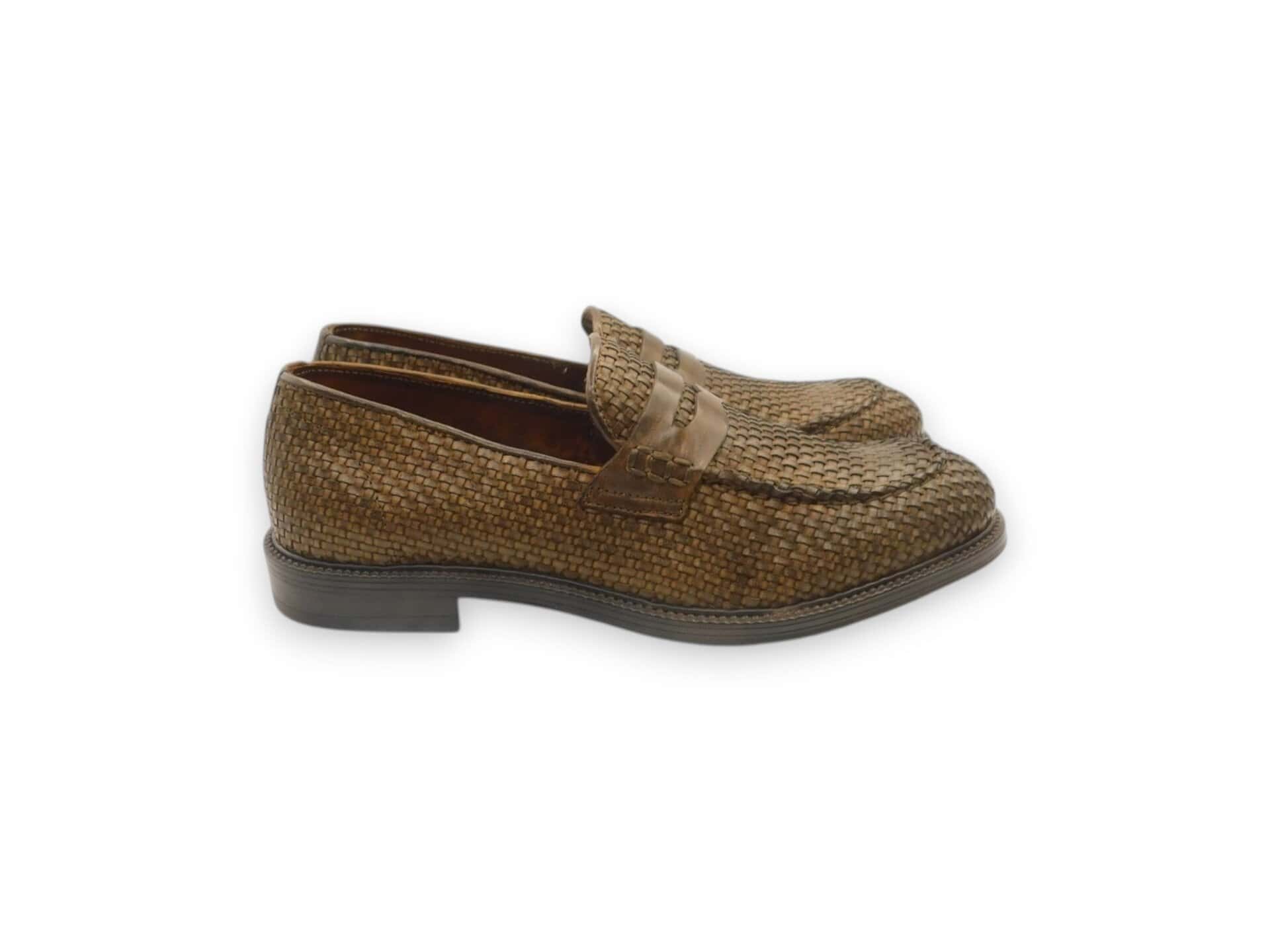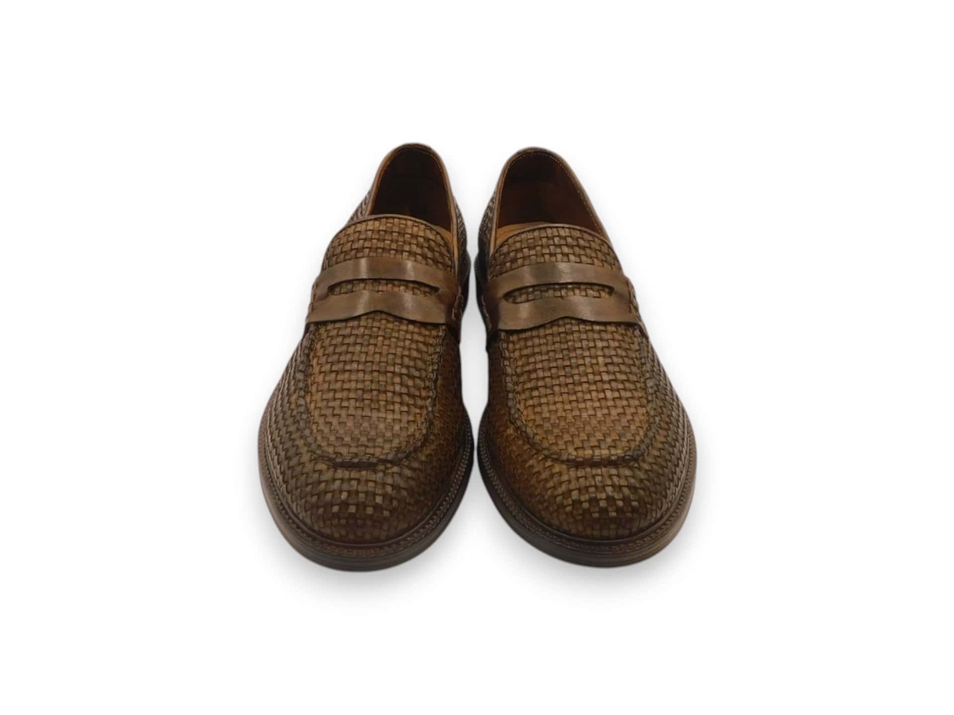 Mocassino in vitello intrecciato. Fondo in cuoio e gomma antiscivolo. Interno foderato in pelle.