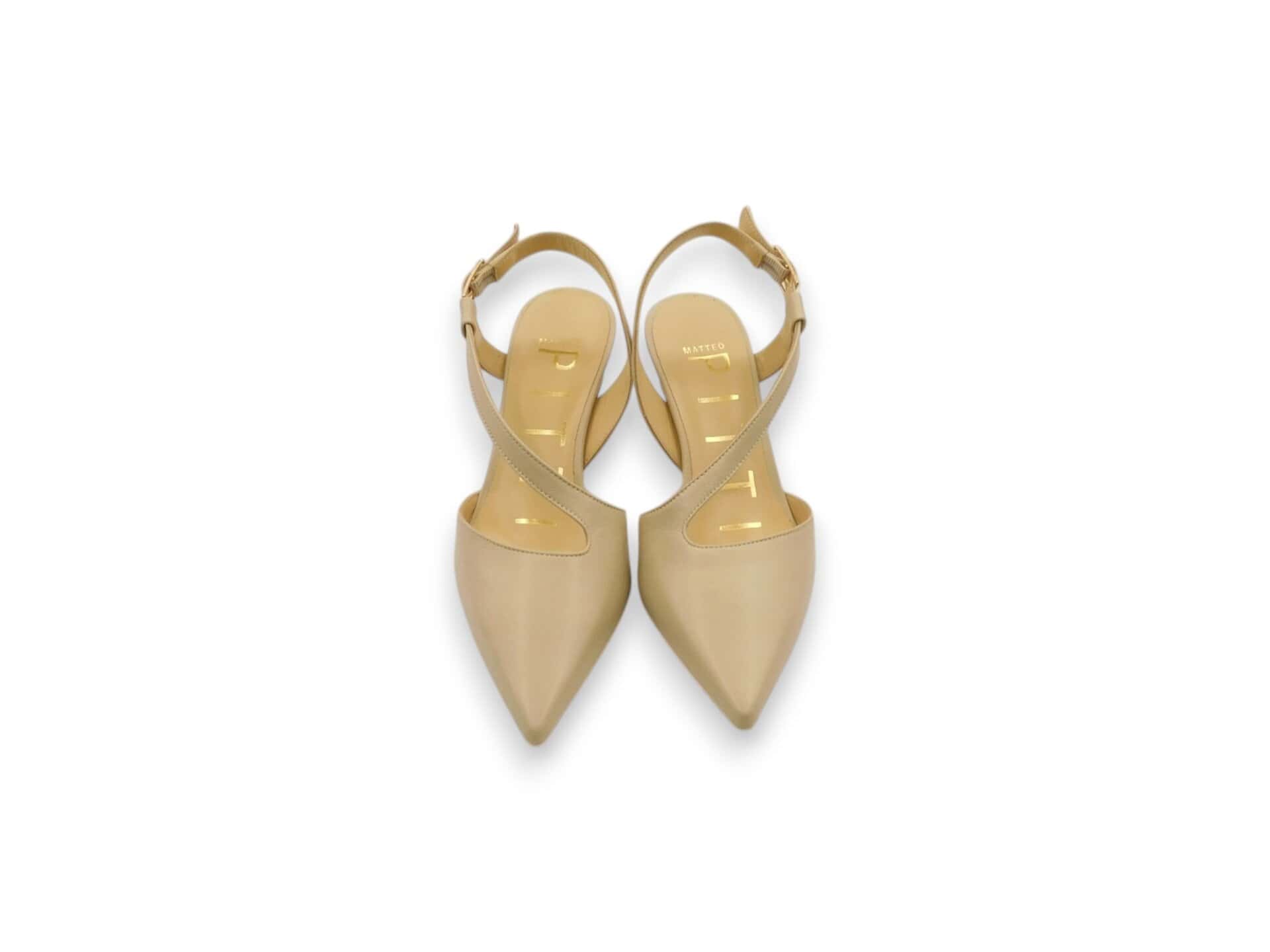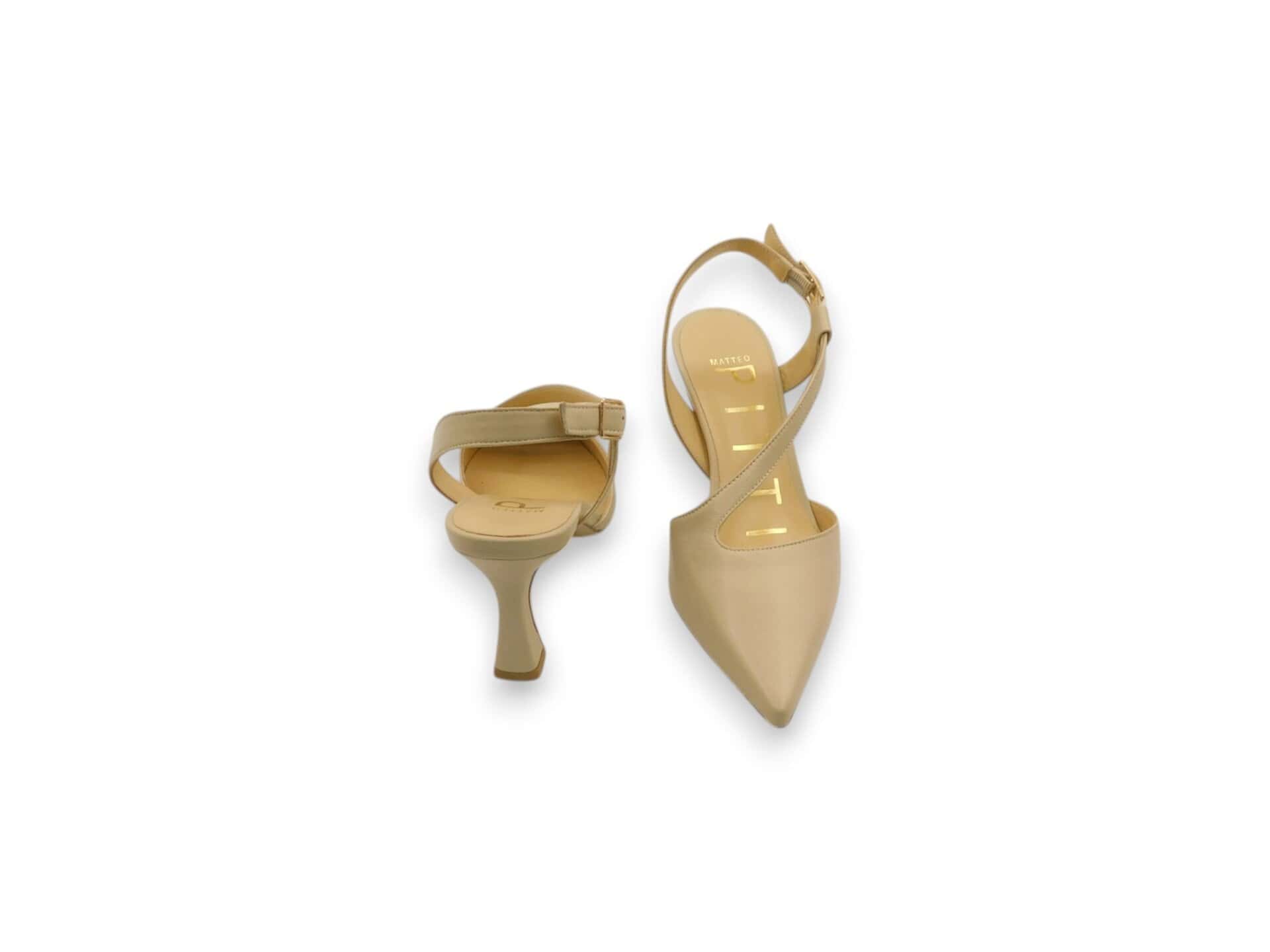 Slingback in vitello con cinturino trasversale sul collo in tono. Chiusura sul lato con fibbia in metallo. Tacco rocchetto 7 cm. Fondo in cuoio.