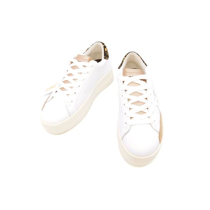 Sneaker in vitello bianco con inserto in camoscio. Logo laterale. Talloncino maculato. Fondo in gomma.