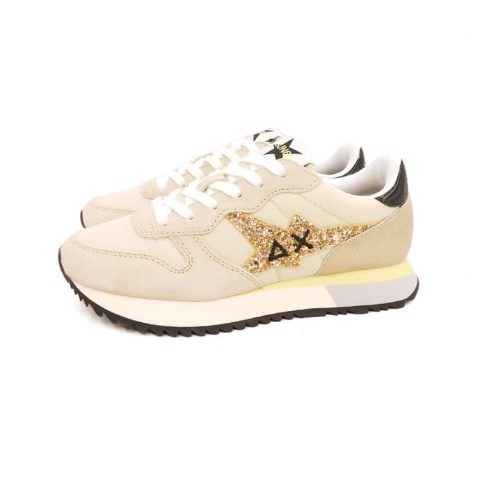 Sneaker in camoscio e tessuto tecnico. Applicazione glitter con logo. Fondo in gomma.