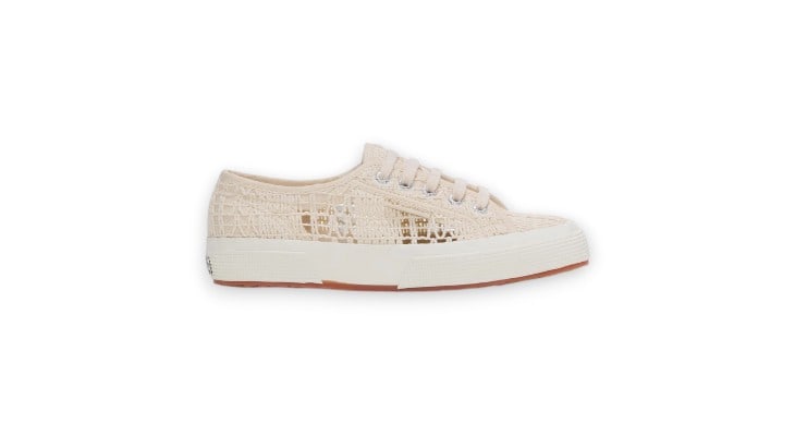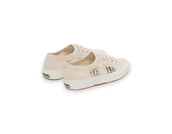 Tomaia in crochet. Sfoderata. Label laterale con logo jacquard bicolor. Logo stampato sul retro e sul sottopiede. Occhielli in alluminio con logo inciso. Chiusura con lacci in cotone. Suola in gomma naturale vulcanizzata.